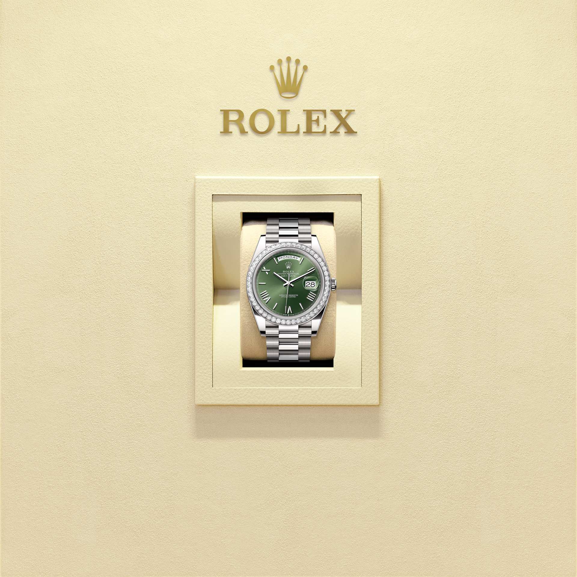 The Oyster Perpetual Day-Date 40 in 18 ct white gold with an olive-green dial, diamond-set bezel and a President bracelet.