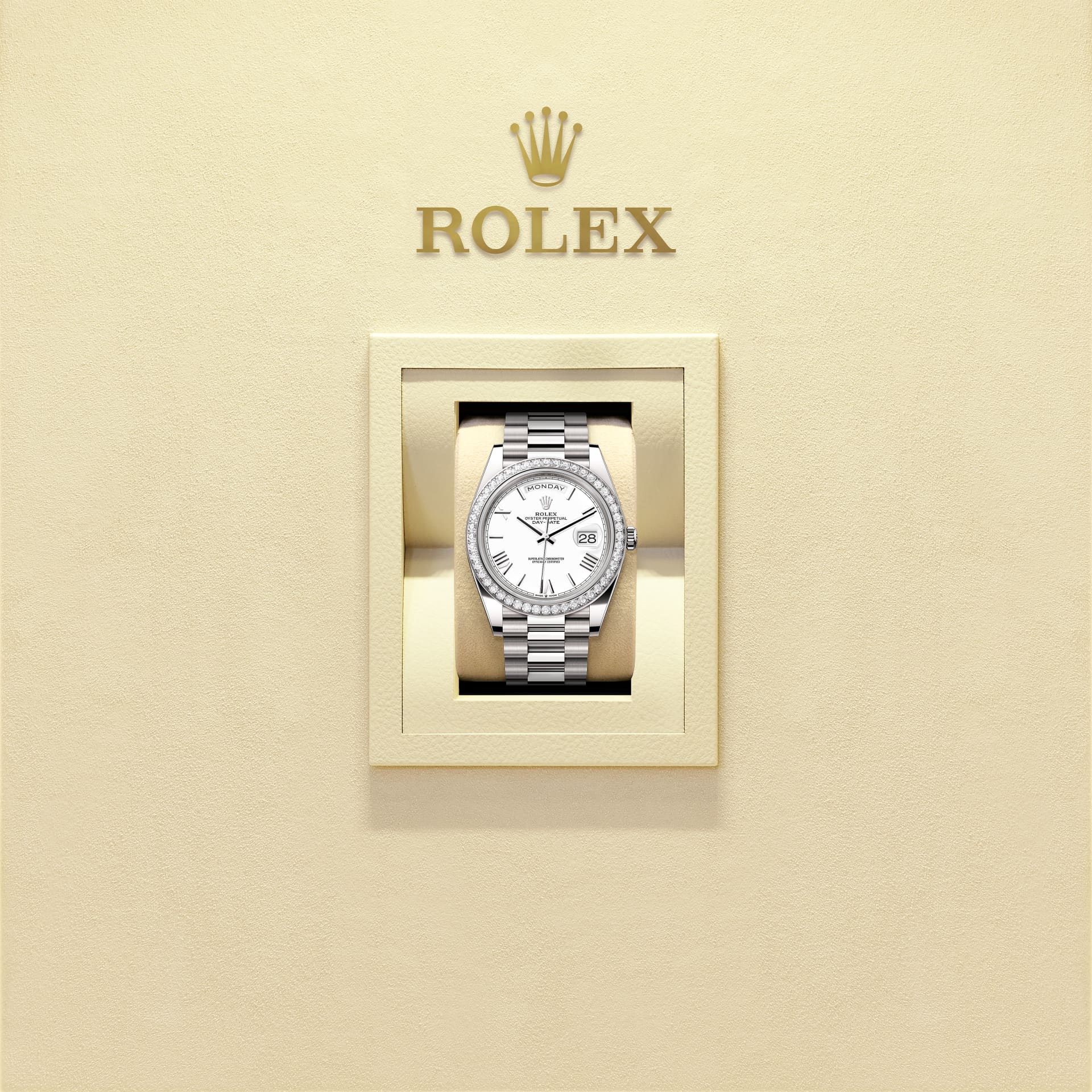 The Oyster Perpetual Day-Date 40 in 18 ct white gold with a white dial, diamond-set bezel and a President bracelet.