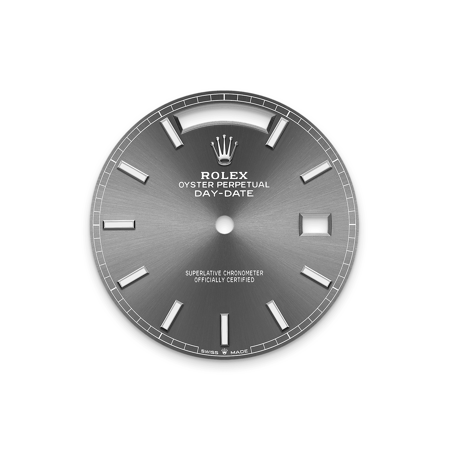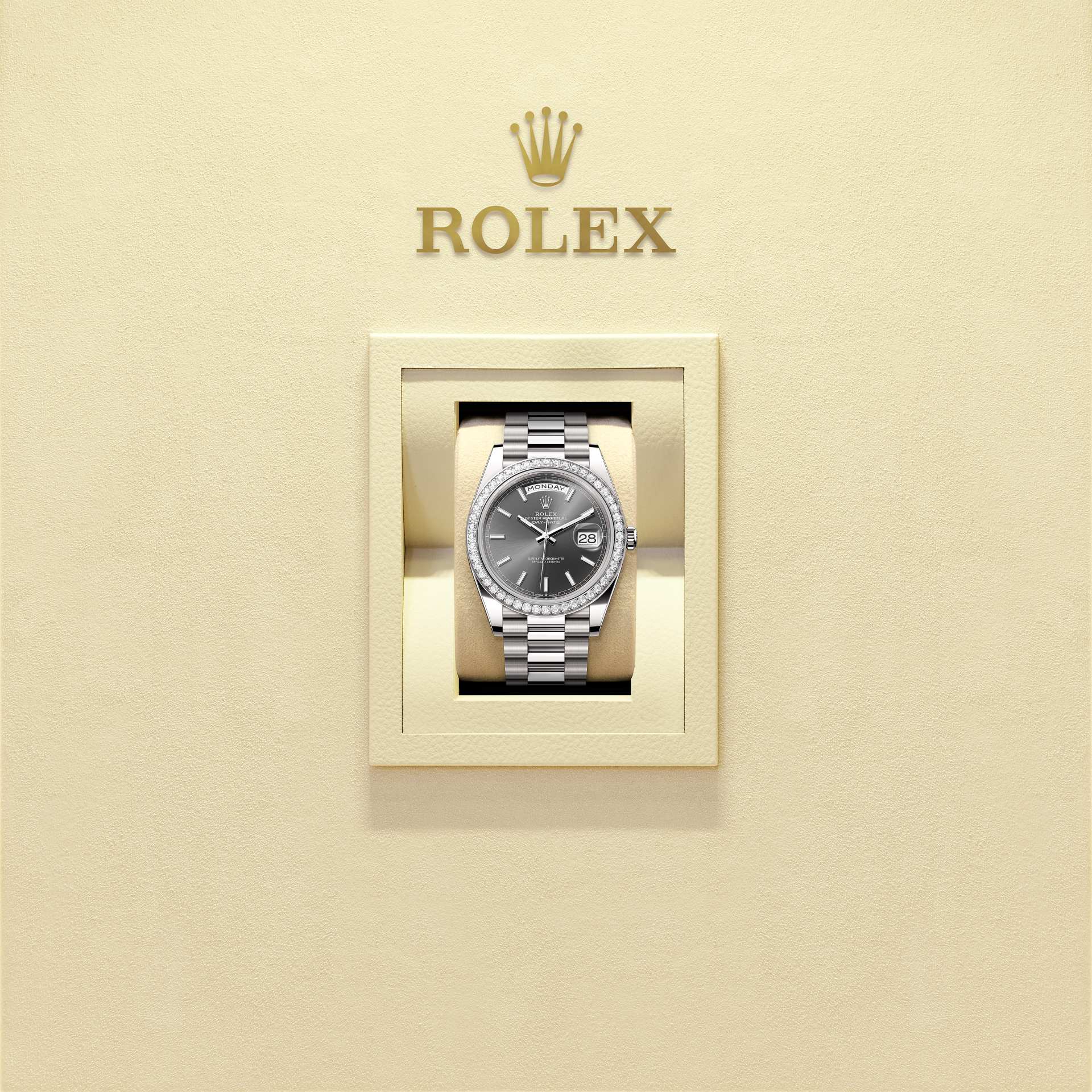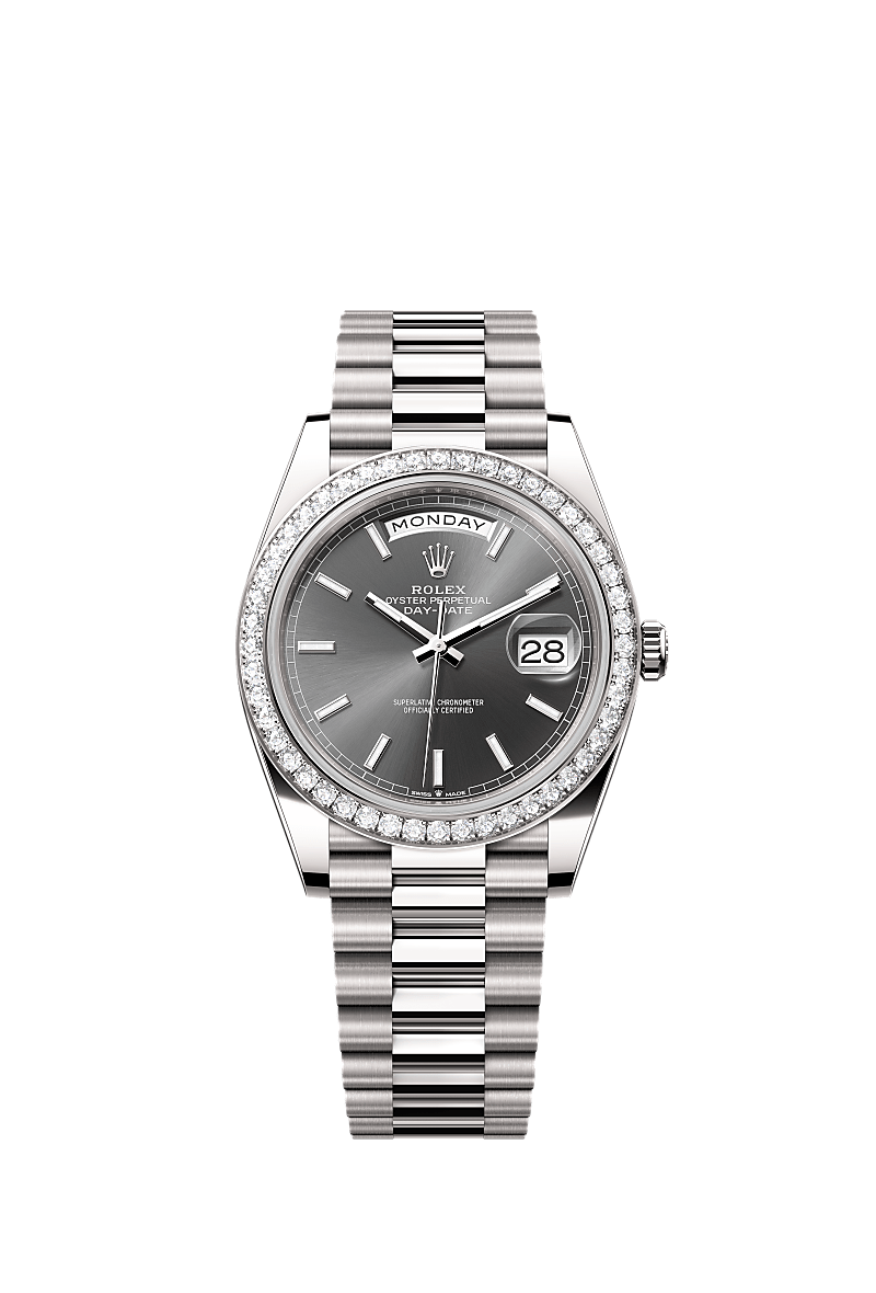 The Oyster Perpetual Day-Date 40 in 18 ct white gold with a slate dial, diamond-set bezel and a President bracelet.