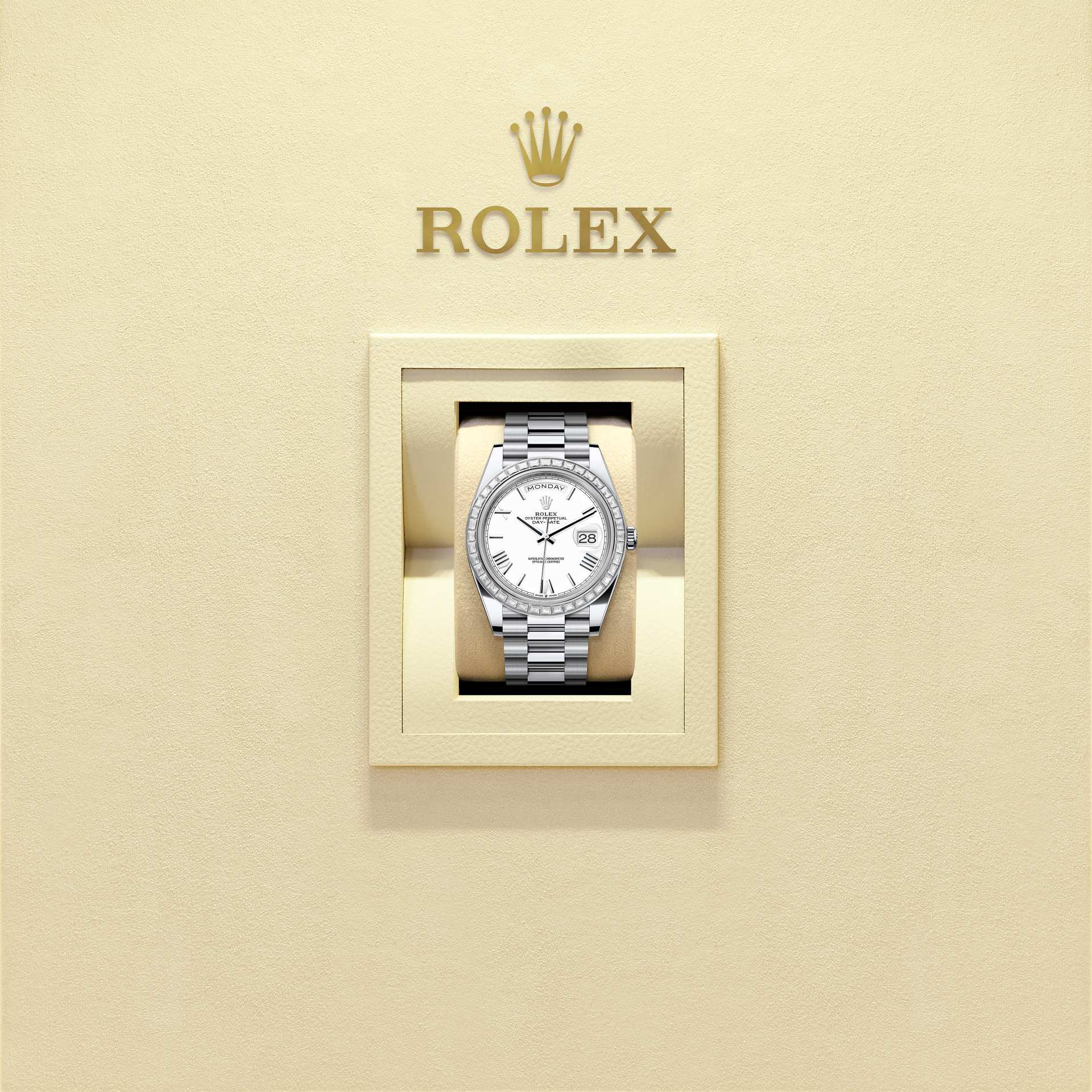 The Oyster Perpetual Day-Date 40 in platinum with a white dial, diamond-set bezel and a President bracelet.