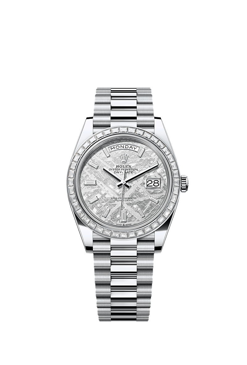 The Oyster Perpetual Day-Date 40 in platinum, with a meteorite, diamond-set dial, diamond-set bezel and a President bracelet.