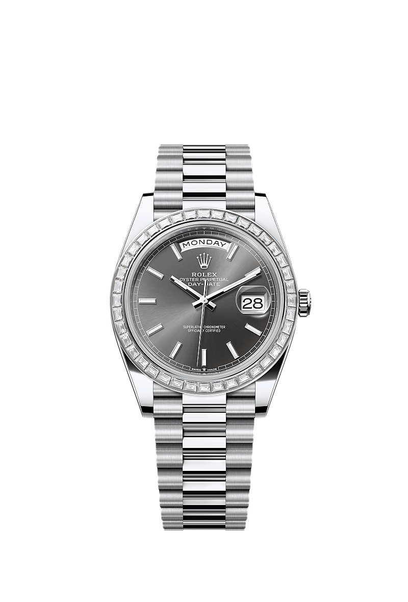 The Oyster Perpetual Day-Date 40 in platinum with a slate dial, diamond-set bezel and a President bracelet.