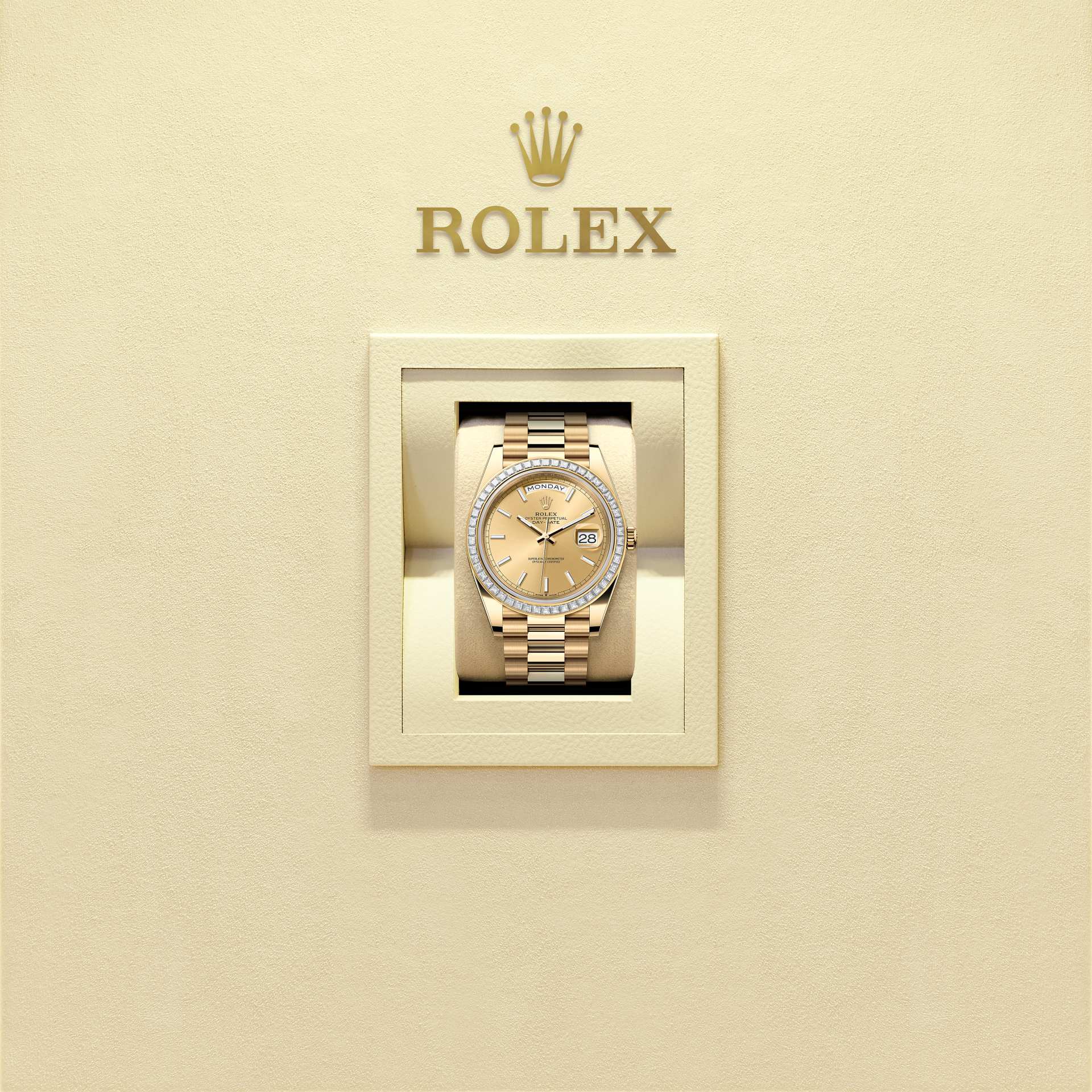 The Oyster Perpetual Day-Date 40 in 18 ct yellow gold with a champagne-colour dial, diamond-set bezel and a President bracelet.