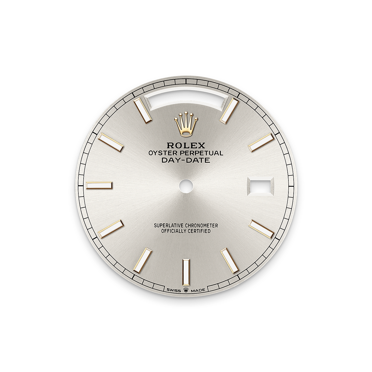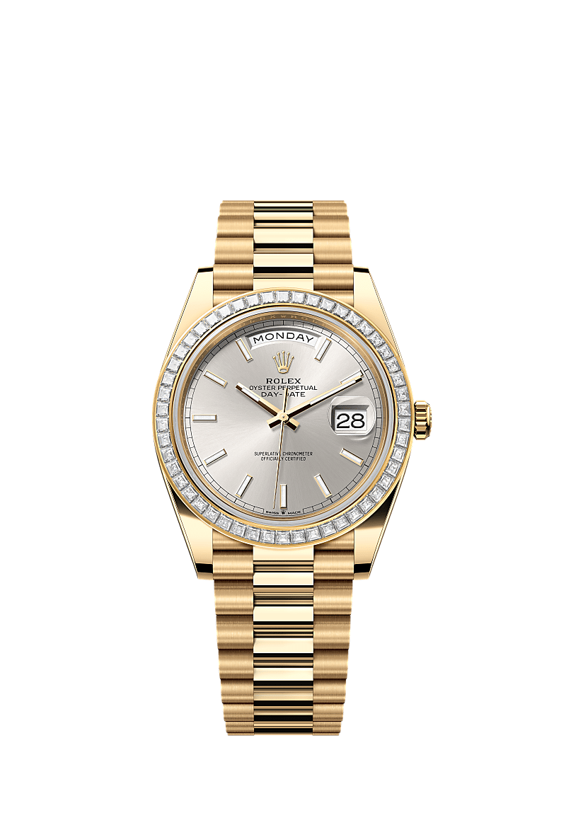 The Oyster Perpetual Day-Date 40 in 18 ct yellow gold with a silver dial, diamond-set bezel and a President bracelet.