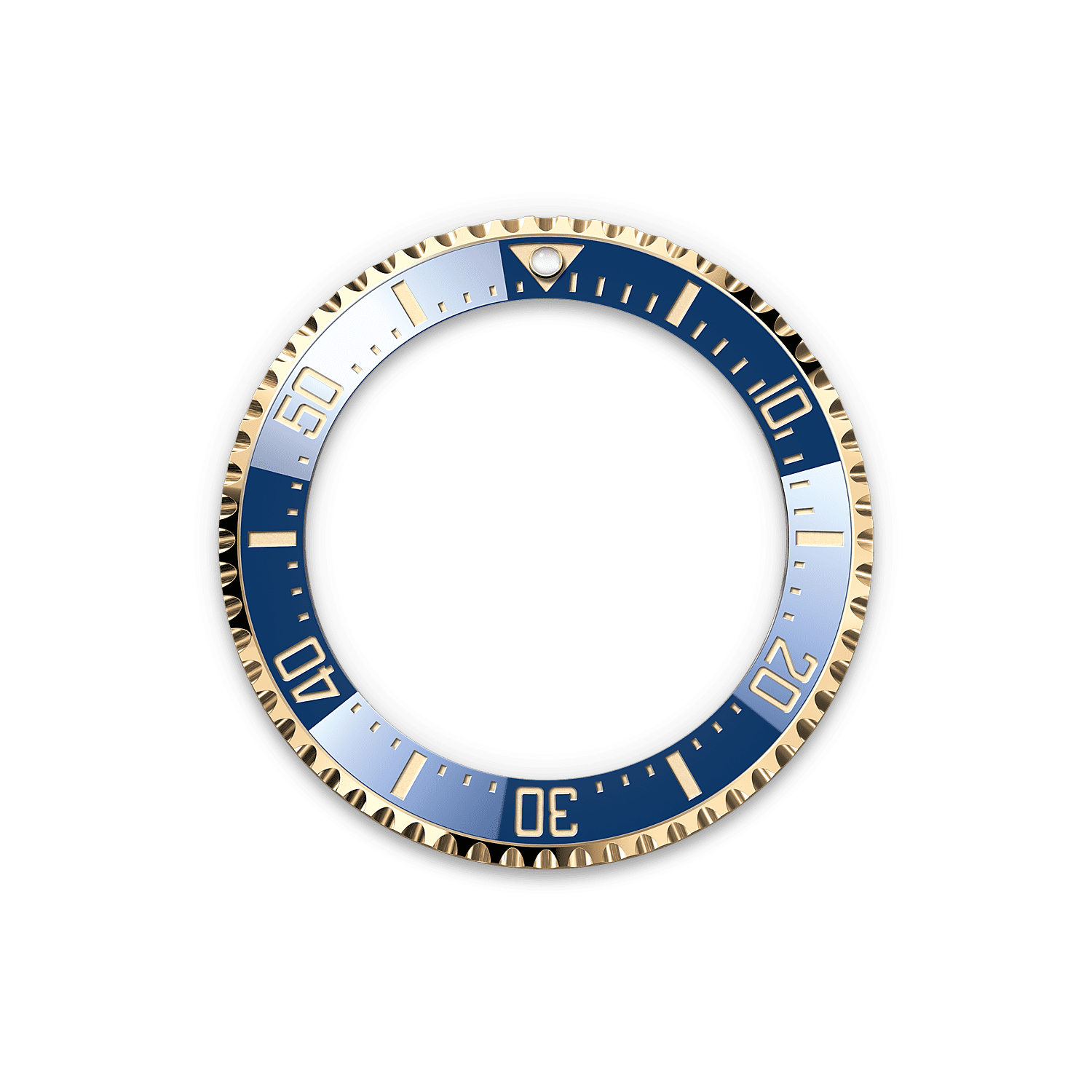 The blues found in the compression ring, the dial and the Cerachrom bezel insert combine to create a subtle oceanic palette that is accentuated by the 18 ct yellow gold of the case and the Oyster bracelet.