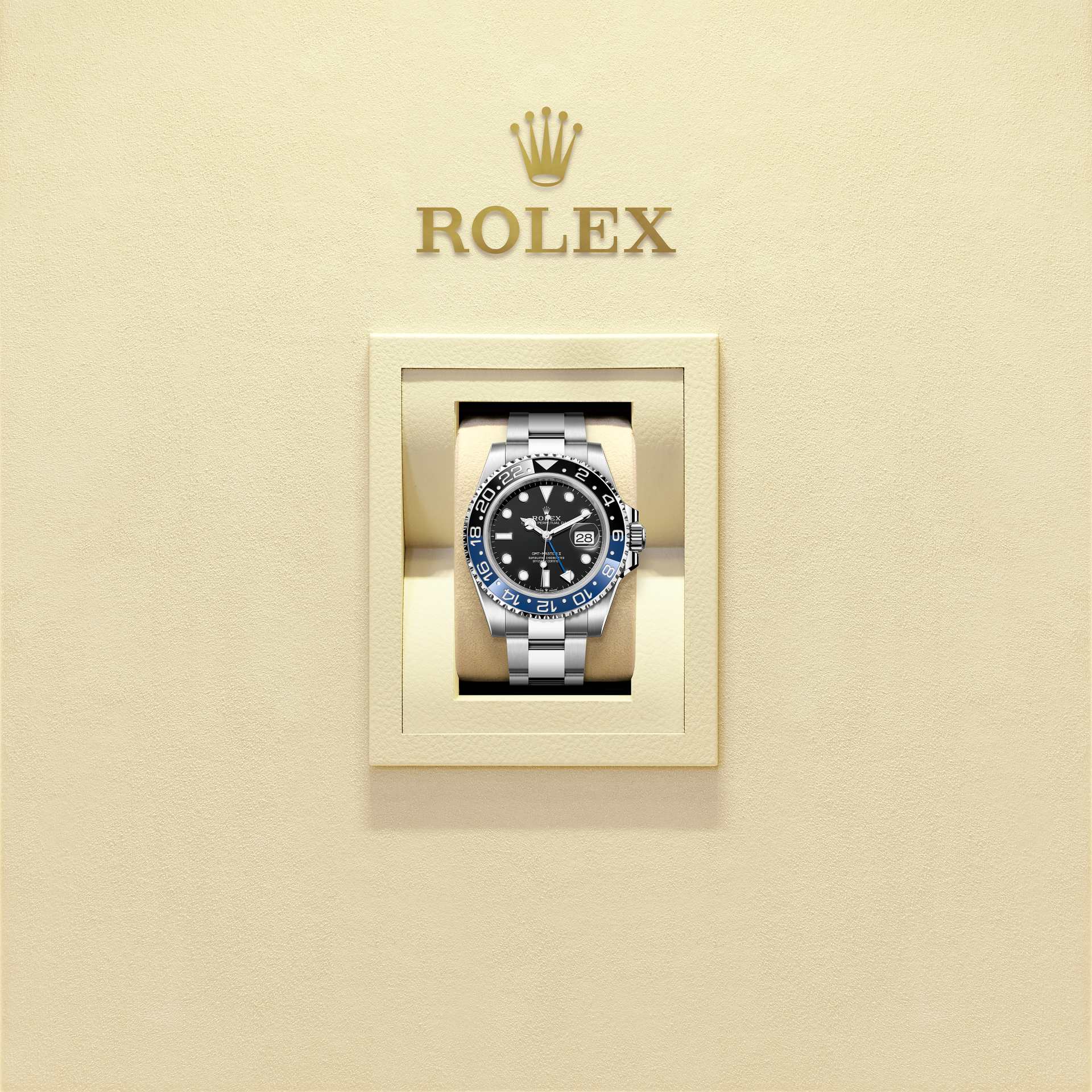 This model features a black dial and a two-colour Cerachrom bezel insert in blue and black ceramic. In addition to conventional hour, minute and seconds hands, the GMT-Master II features an arrow-tipped hand, which circles the dial once every 24 hours, as well as a bidirectional rotatable 24-hour graduated bezel.