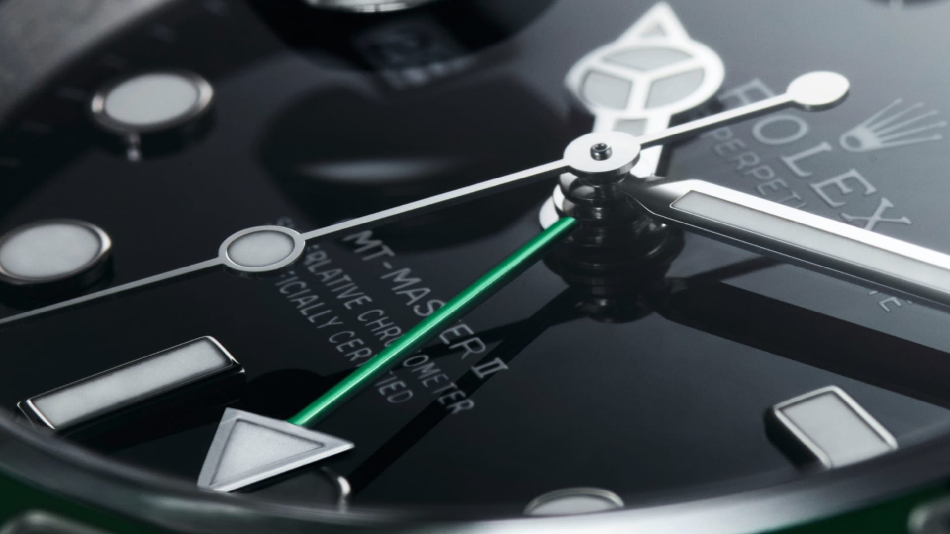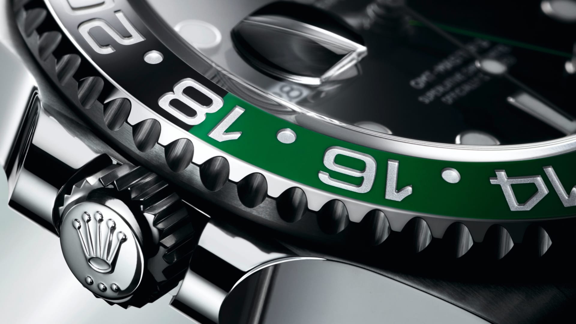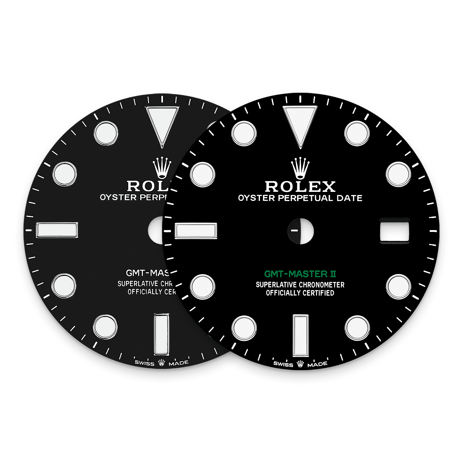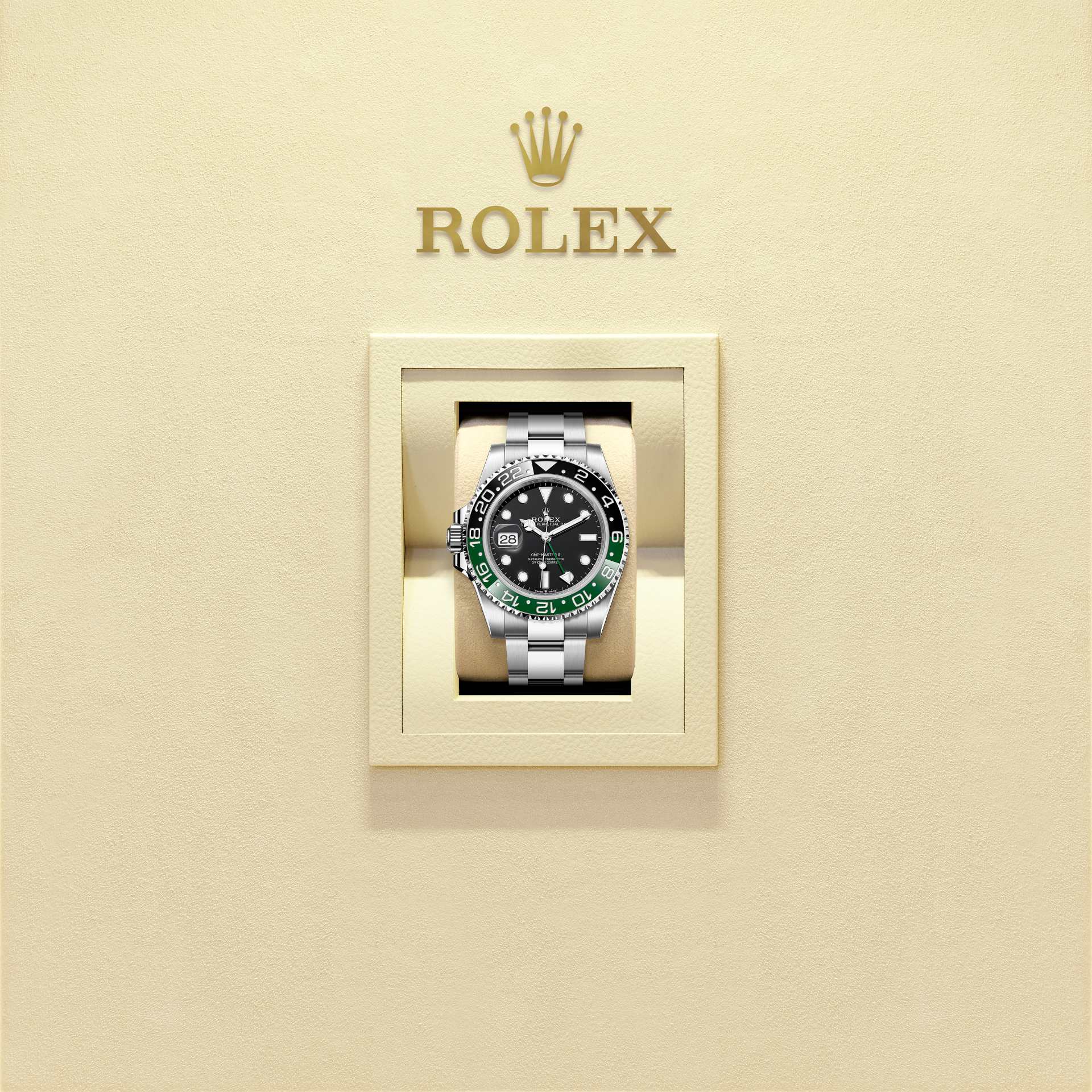 This model features a black dial and a two-colour Cerachrom bezel insert in green and black ceramic. In addition to conventional hour, minute and seconds hands, the GMT-Master II features an arrow-tipped hand, which circles the dial once every 24 hours, as well as a bidirectional rotatable 24-hour graduated bezel.