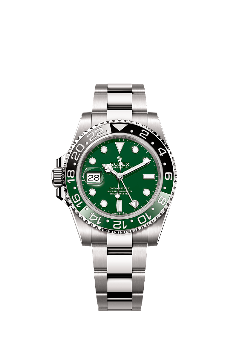 The Oyster Perpetual GMT-Master II in 18 ct white gold with a green ceramic dial and an Oyster bracelet.