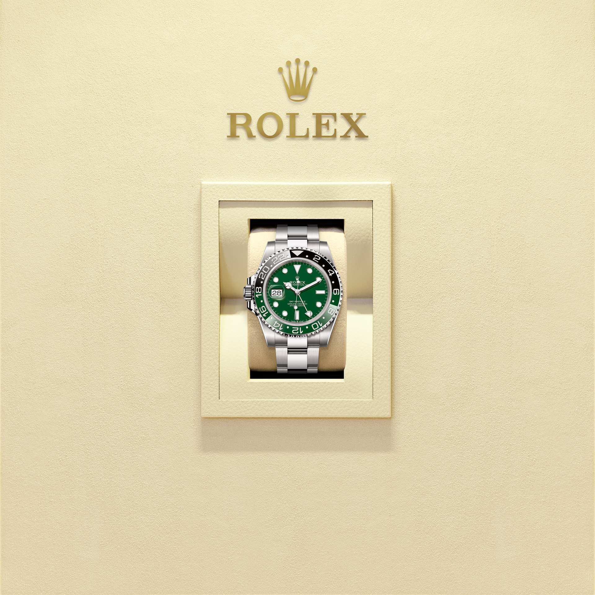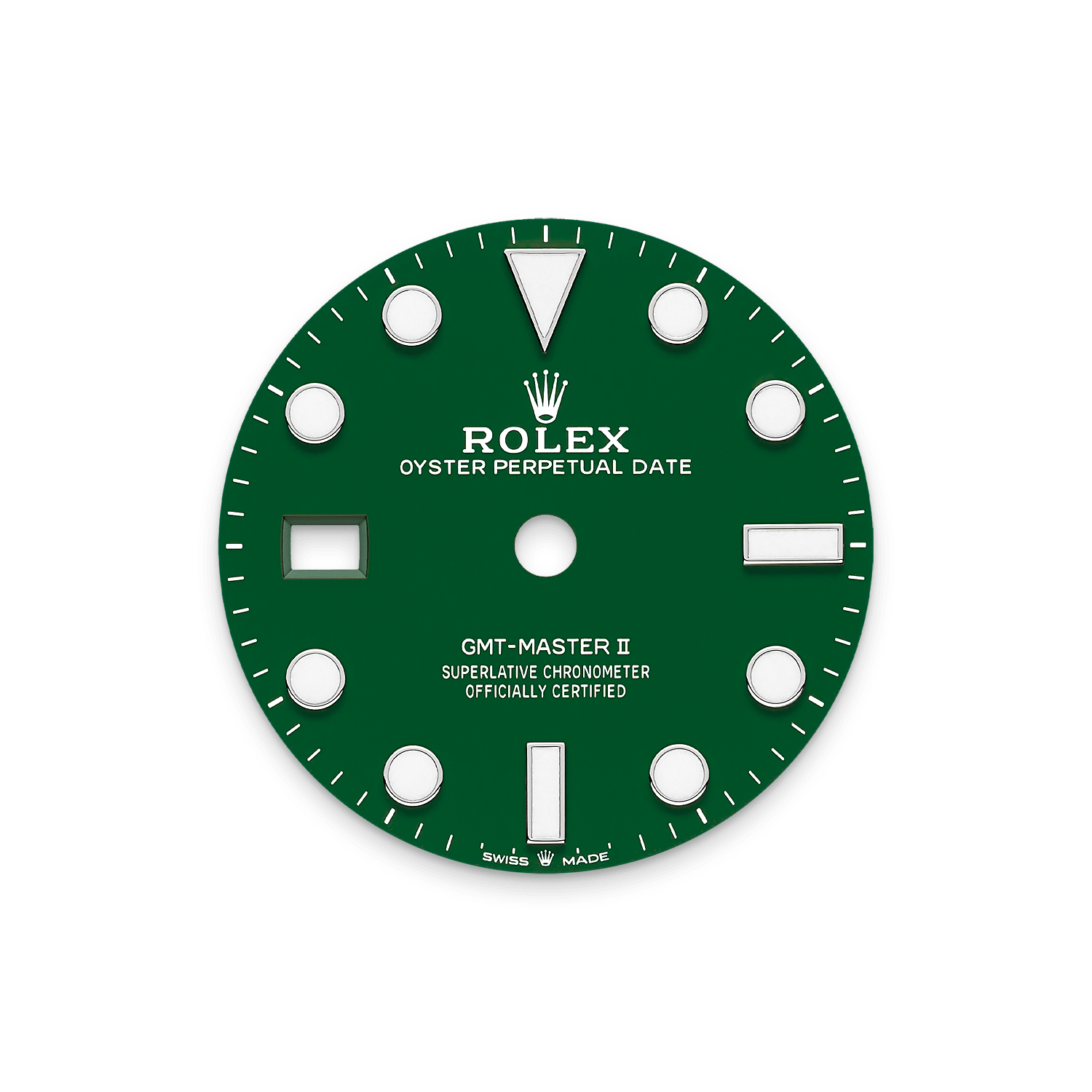 This model features a green ceramic dial and a two-colour Cerachrom bezel insert in green and black ceramic. In addition to conventional hour, minute and seconds hands, the GMT-Master II features an arrow-tipped hand, which circles the dial once every 24 hours, as well as a bidirectional rotatable 24-hour graduated bezel.