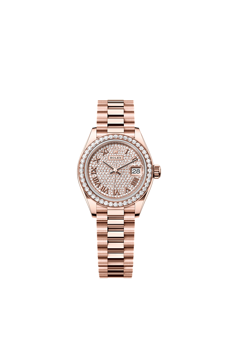 This Oyster Perpetual Lady-Datejust in 18 ct Everose gold features a diamond-paved dial and a President bracelet.