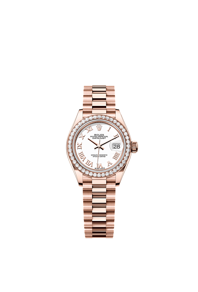 This Oyster Perpetual Lady-Datejust in 18 ct Everose gold features a white dial and a President bracelet.