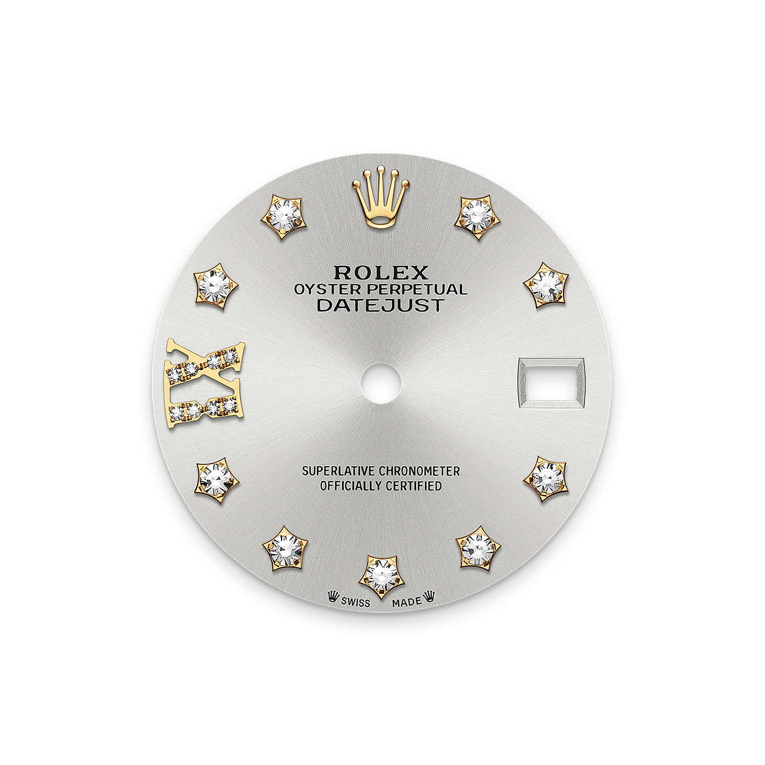 This dial features diamonds in 18 ct gold settings and a Roman IX in 18 ct gold, set with 8 diamonds. The sunray finish creates delicate light reflections on many dials in the Oyster Perpetual collection. It is obtained using masterful brushing techniques that create grooves running outwards from the centre of the dial.