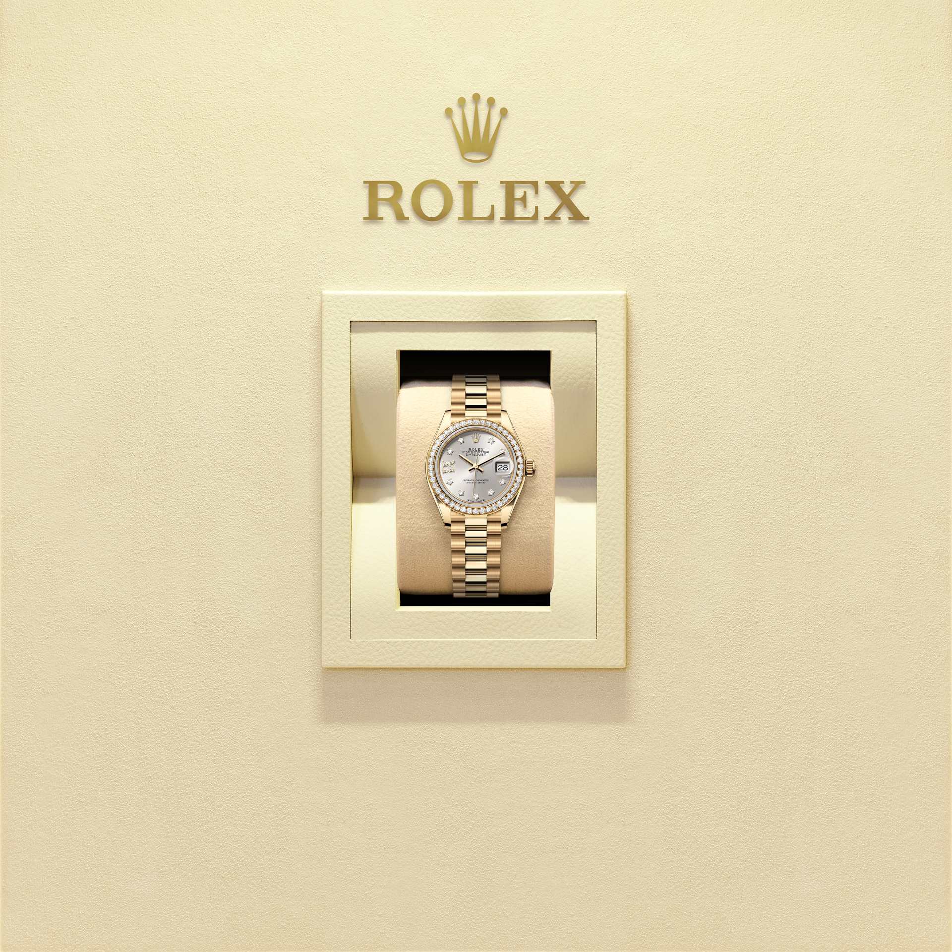 This Lady-Datejust is offered on a prestigious President bracelet. Always in solid gold or platinum, the bracelets benefit from a concealed attachment beneath the bezel which ensures seamless visual continuity between the bracelet and case.