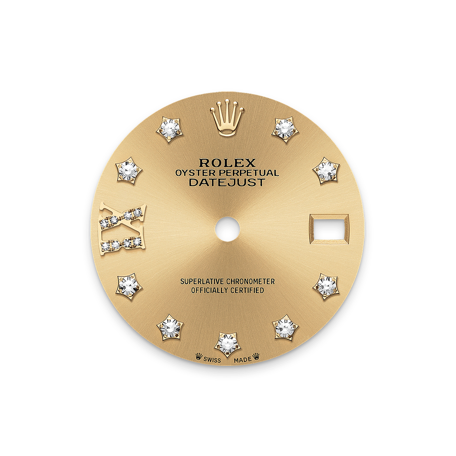 This dial features diamonds in 18 ct gold settings and a Roman IX in 18 ct gold, set with 8 diamonds. The sunray finish creates delicate light reflections on many dials in the Oyster Perpetual collection. It is obtained using masterful brushing techniques that create grooves running outwards from the centre of the dial.