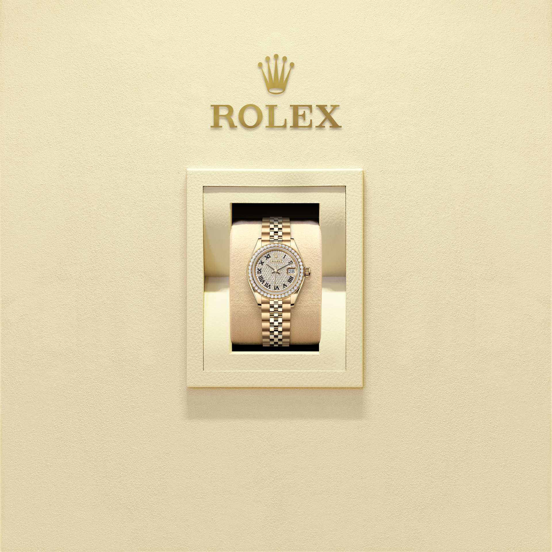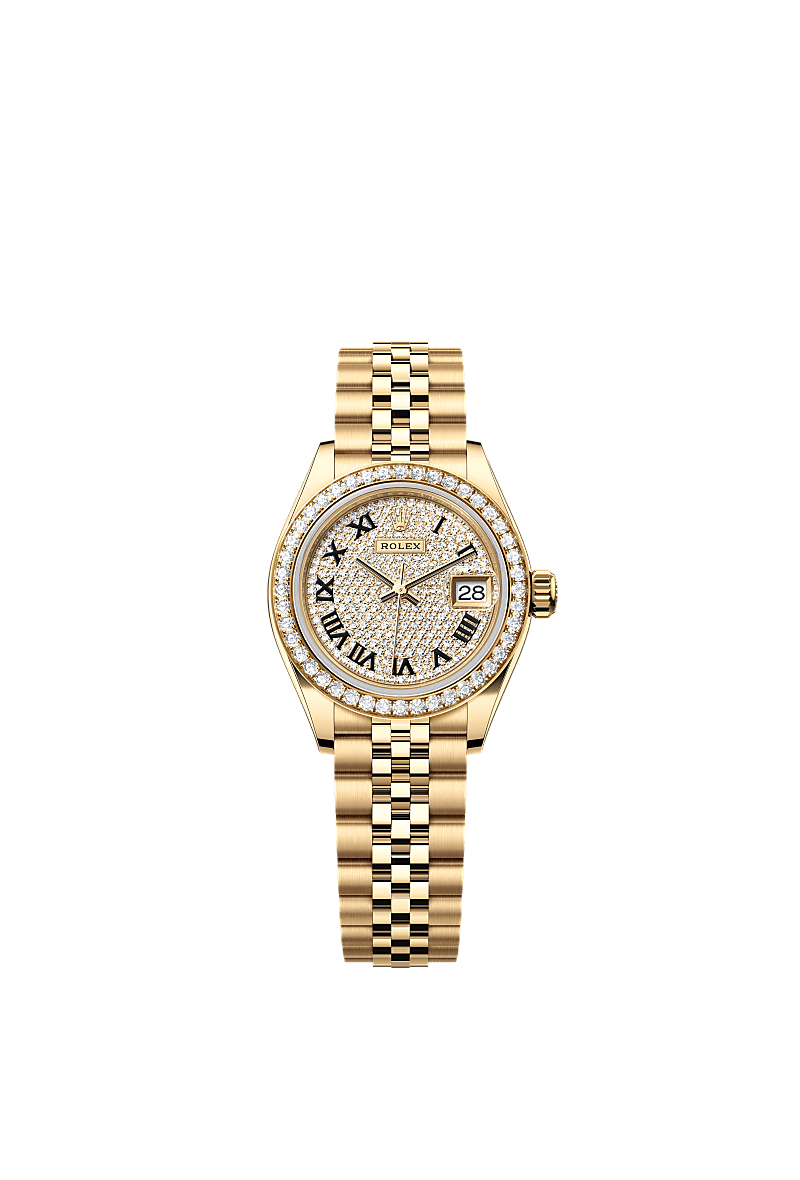 This Oyster Perpetual Lady-Datejust in 18 ct yellow gold features a diamond-paved dial and a Jubilee bracelet.