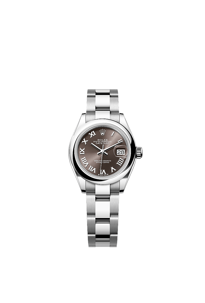 This Oyster Perpetual Lady-Datejust in Oystersteel features a dark grey dial and an Oyster bracelet.