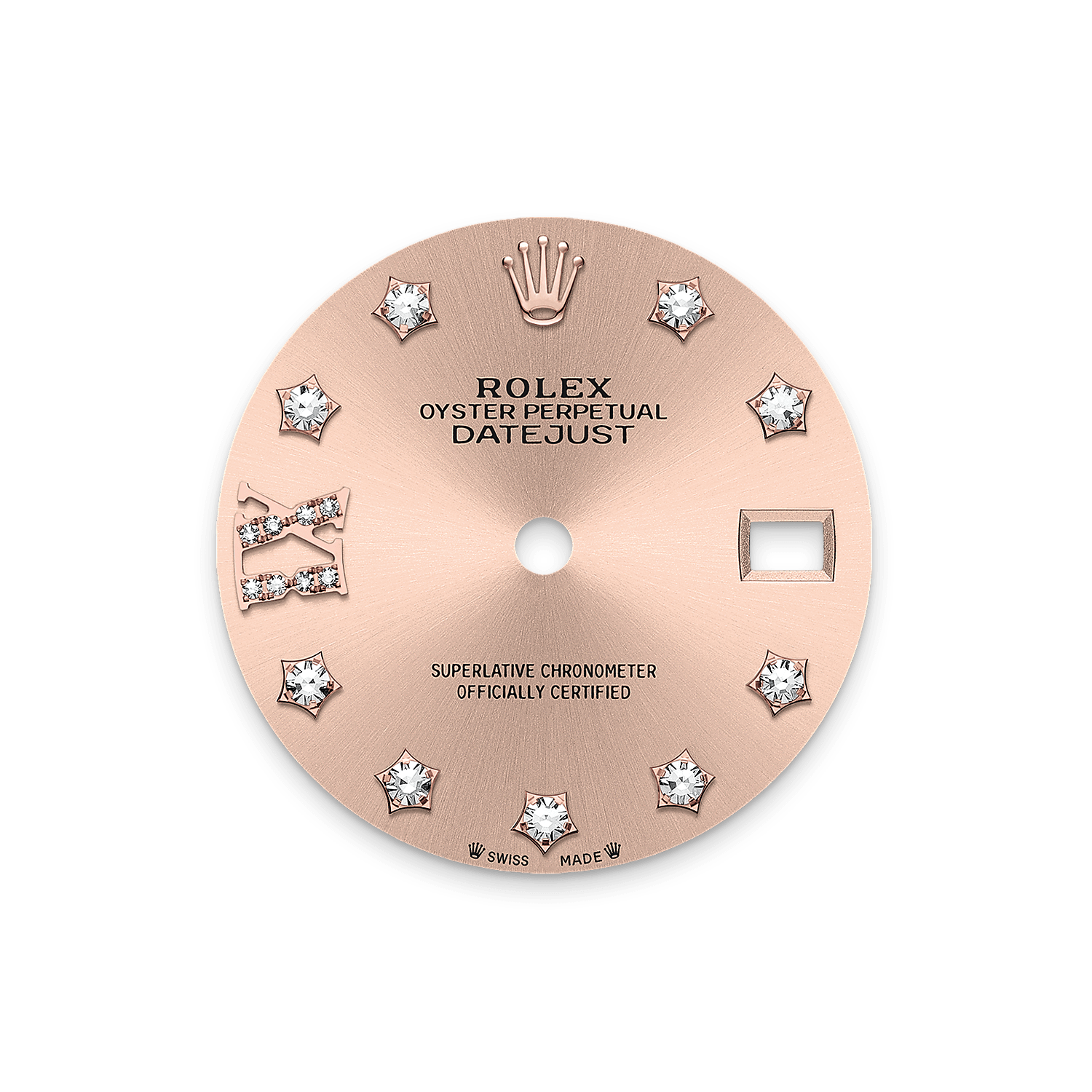 This dial features diamonds in 18 ct gold settings and a Roman IX in 18 ct gold, set with 8 diamonds. The sunray finish creates delicate light reflections on many dials in the Oyster Perpetual collection. It is obtained using masterful brushing techniques that create grooves running outwards from the centre of the dial.
