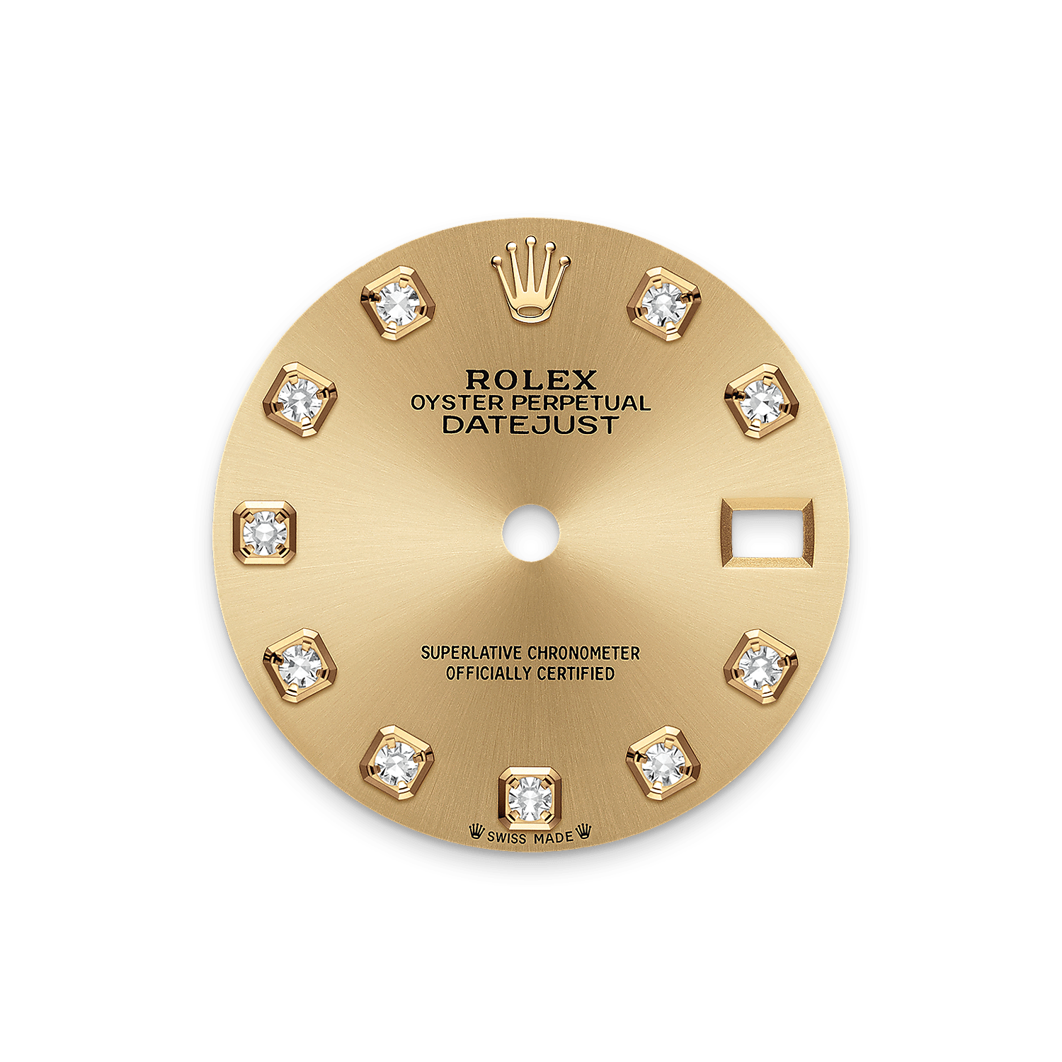 This dial features diamonds in 18 ct gold settings. The sunray finish creates delicate light reflections on many dials in the Oyster Perpetual collection. It is obtained using masterful brushing techniques that create grooves running outwards from the centre of the dial.