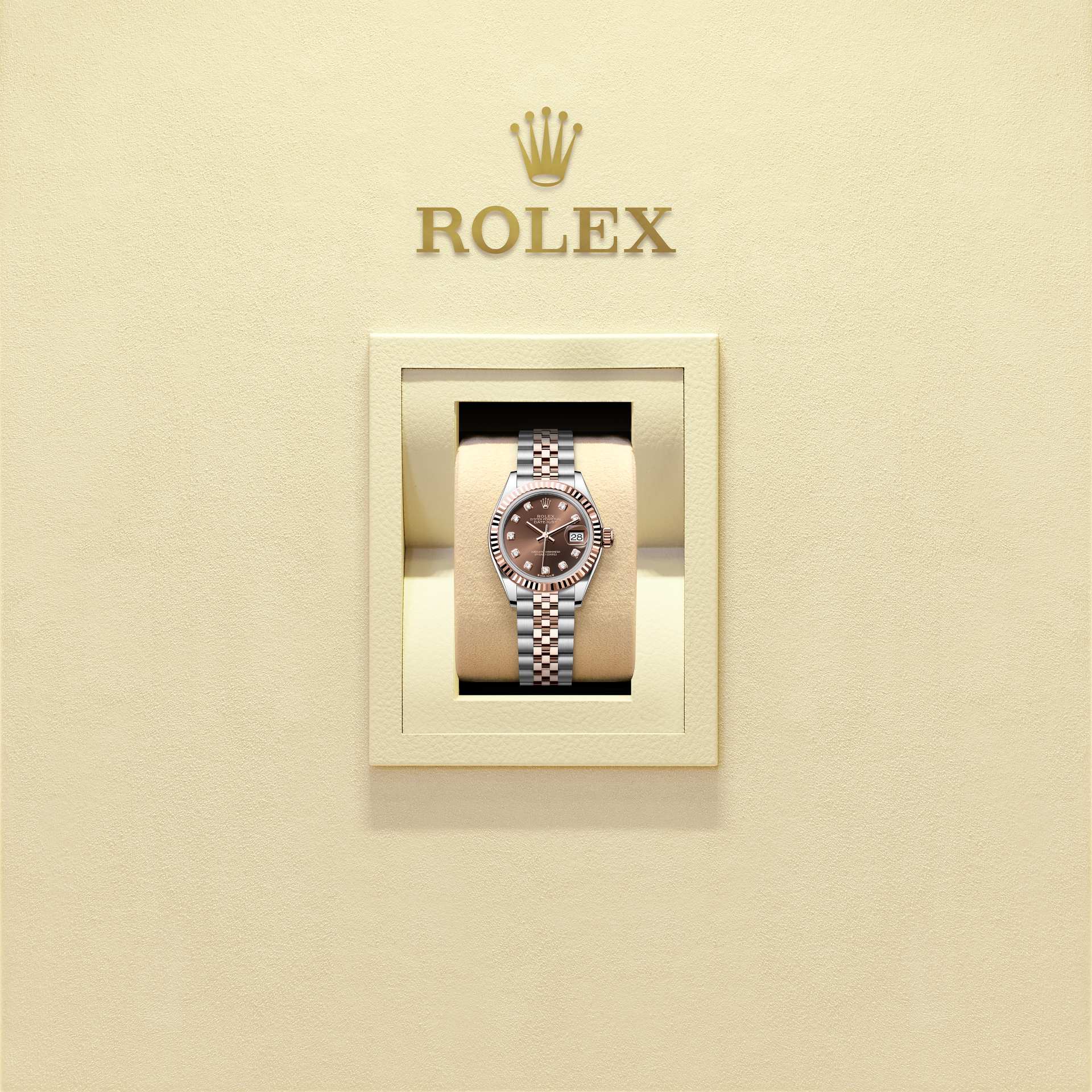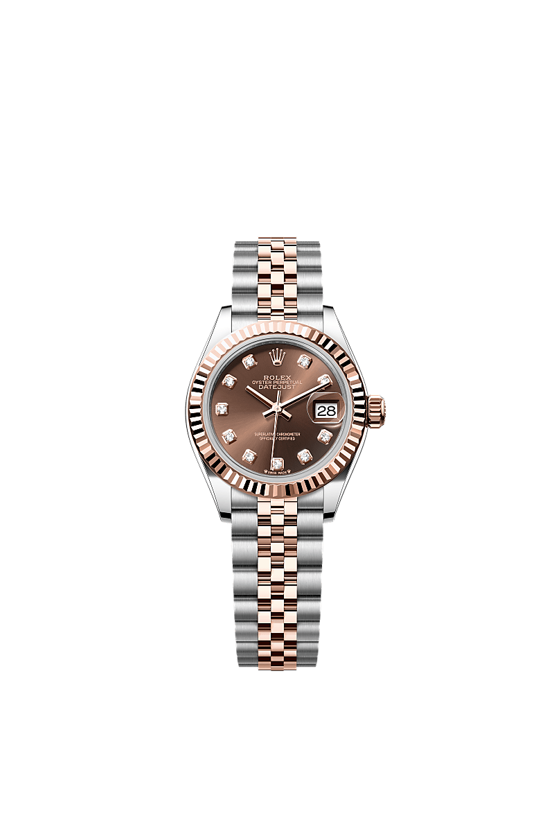 This Oyster Perpetual Lady-Datejust in Oystersteel and Everose gold features a chocolate, diamond-set dial and a Jubilee bracelet.