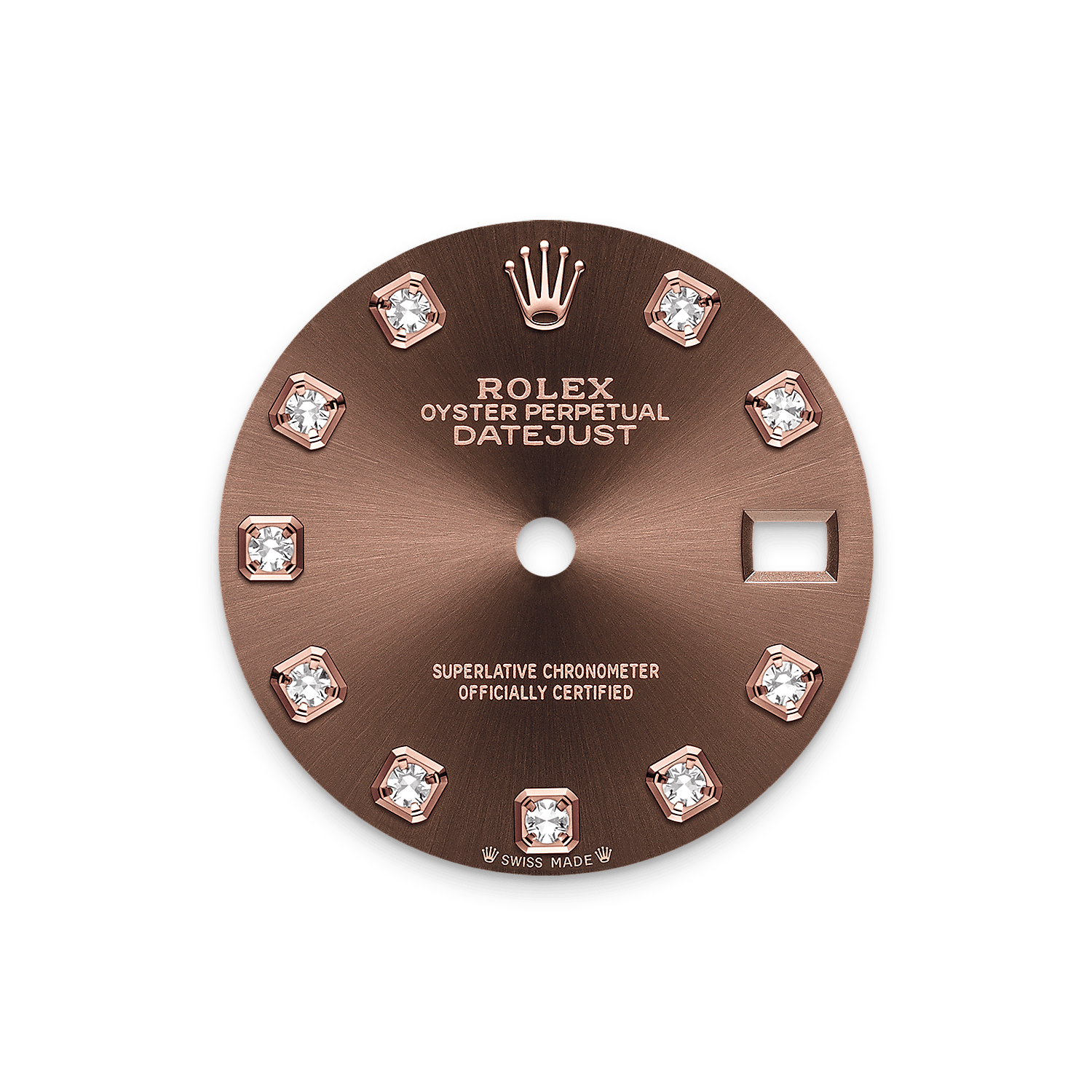 This dial features diamonds in 18 ct gold settings. The sunray finish creates delicate light reflections on many dials in the Oyster Perpetual collection. It is obtained using masterful brushing techniques that create grooves running outwards from the centre of the dial.
