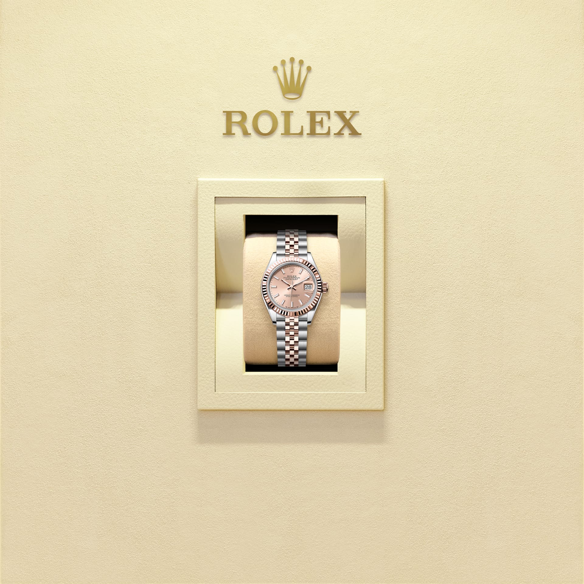 This Oyster Perpetual Lady-Datejust in Oystersteel and Everose gold features a rosé-colour dial and a Jubilee bracelet.