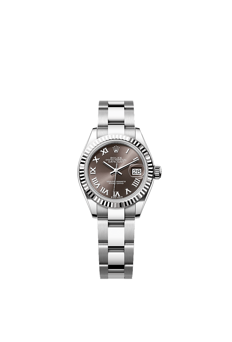 This Oyster Perpetual Lady-Datejust in Oystersteel and white gold features a dark grey dial and an Oyster bracelet.
