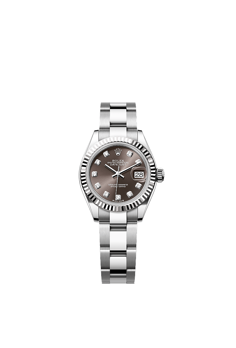 This Oyster Perpetual Lady-Datejust in Oystersteel and white gold features a dark grey, diamond-set dial and an Oyster bracelet.