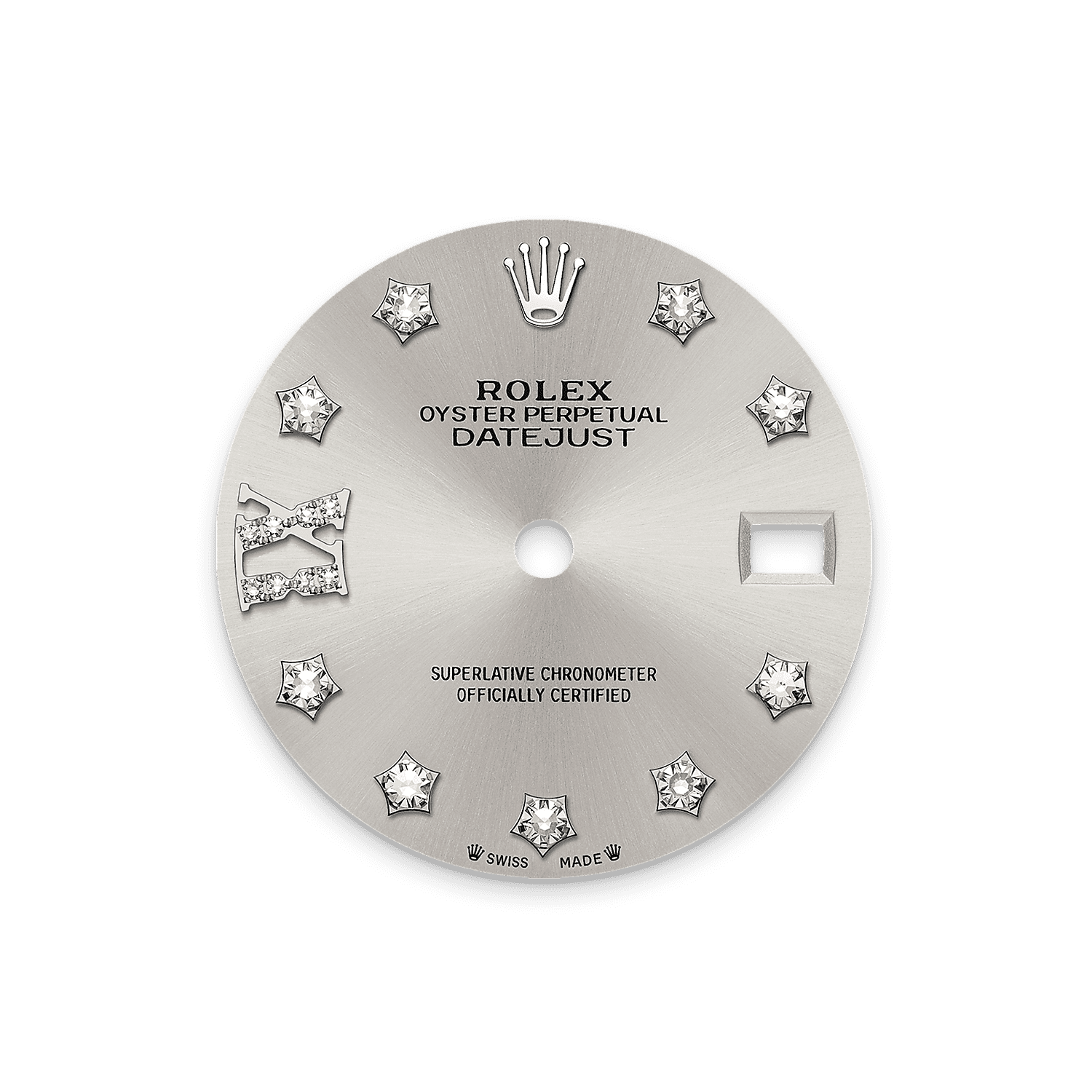This dial features diamonds in 18 ct gold settings and a Roman IX in 18 ct gold, set with 8 diamonds. The sunray finish creates delicate light reflections on many dials in the Oyster Perpetual collection. It is obtained using masterful brushing techniques that create grooves running outwards from the centre of the dial.