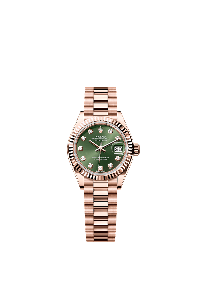 This Oyster Perpetual Lady-Datejust in 18 ct Everose gold features an olive-green, diamond-set dial and a President bracelet.