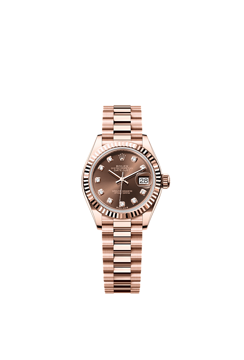 This Oyster Perpetual Lady-Datejust in 18 ct Everose gold features a chocolate, diamond-set dial and a President bracelet.