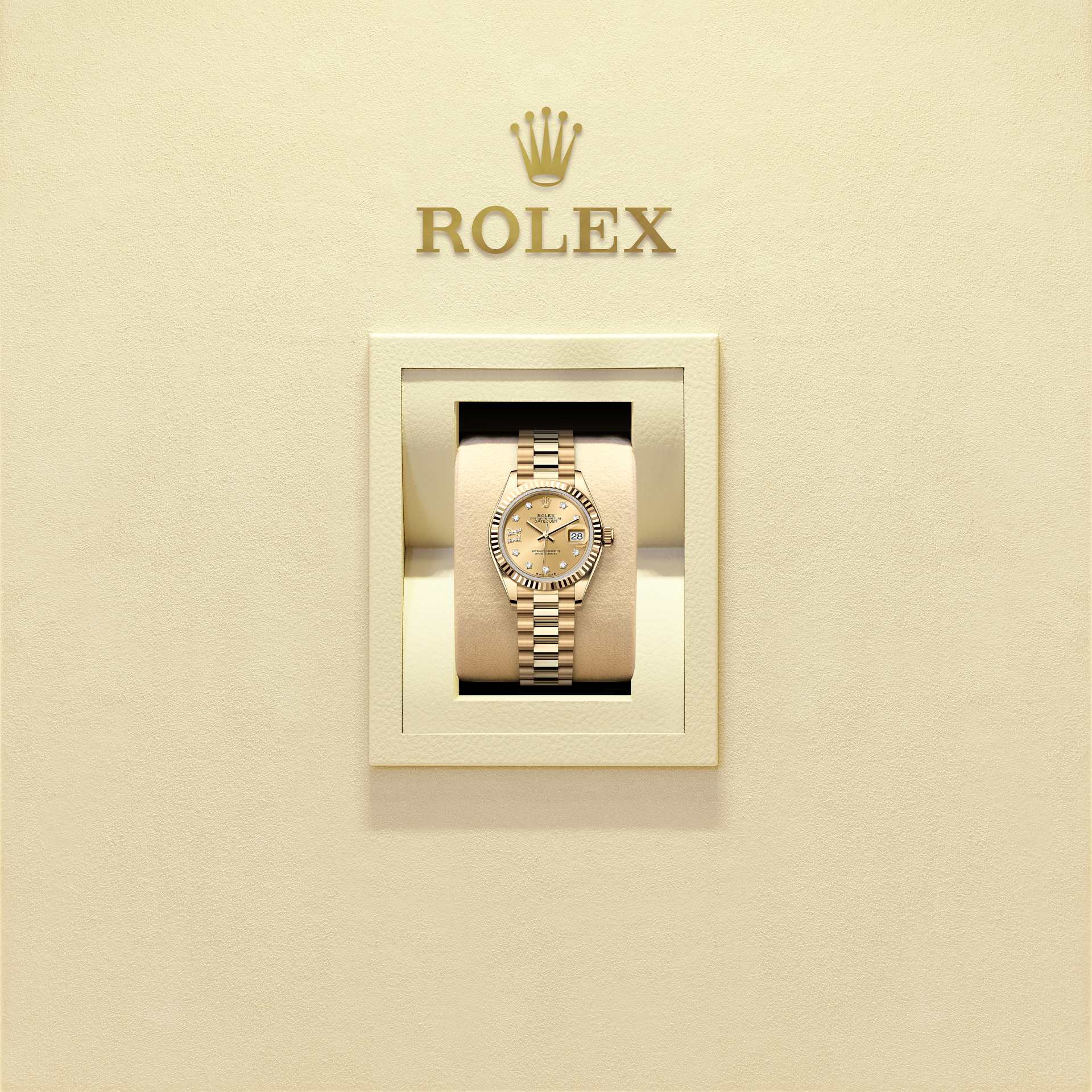 This Oyster Perpetual Lady-Datejust in 18 ct yellow gold features a champagne colour, diamond-set dial and a President bracelet.