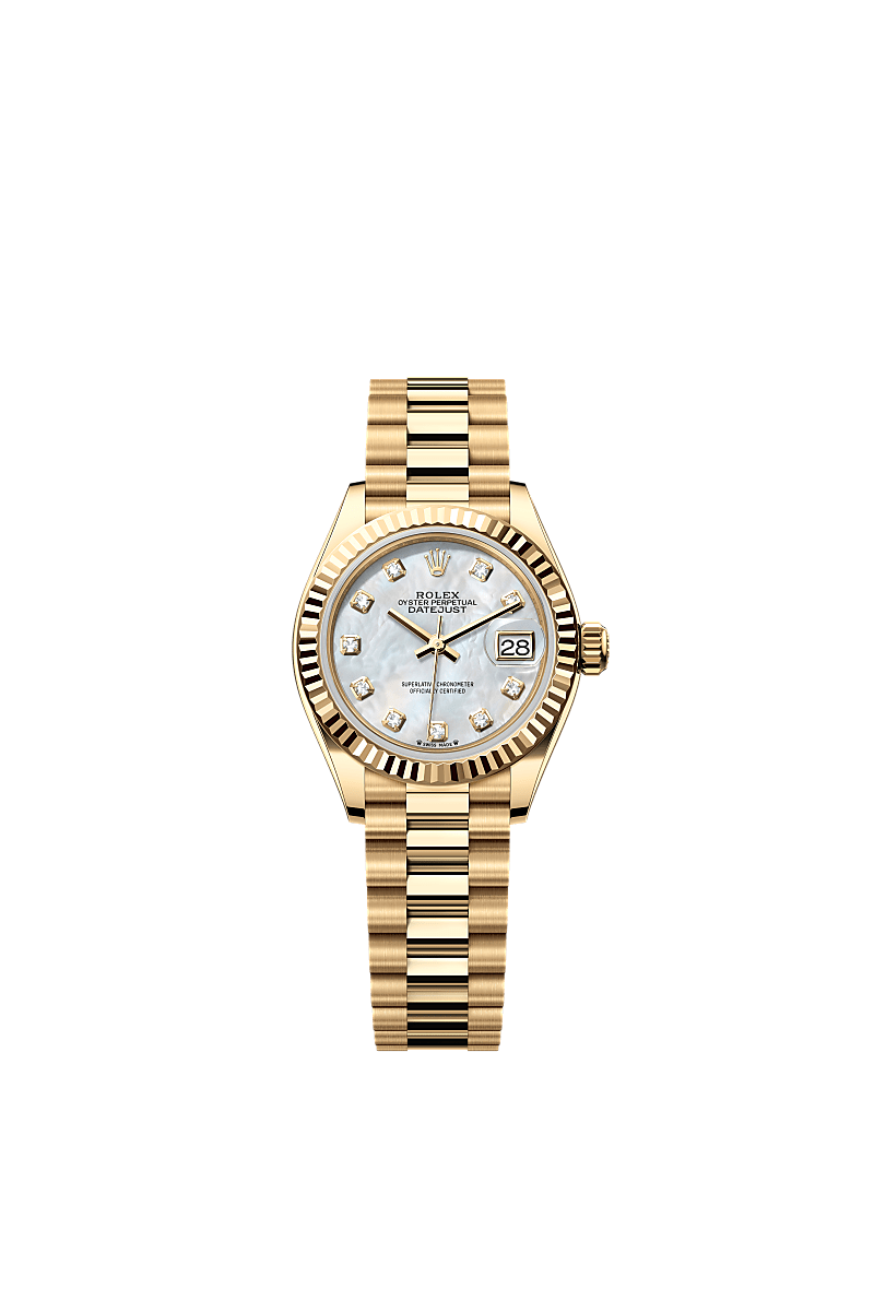 This Oyster Perpetual Lady-Datejust in 18 ct yellow gold features a white mother-of-pearl, diamond-set dial and a President bracelet.