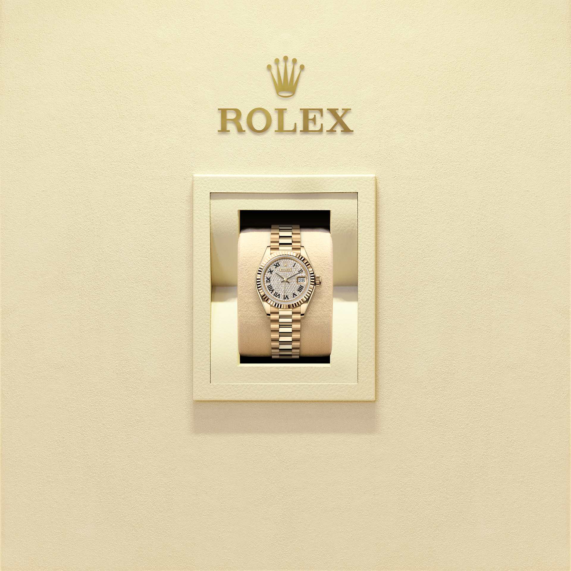 This Oyster Perpetual Lady-Datejust in 18 ct yellow gold features a diamond-paved dial and a President bracelet.