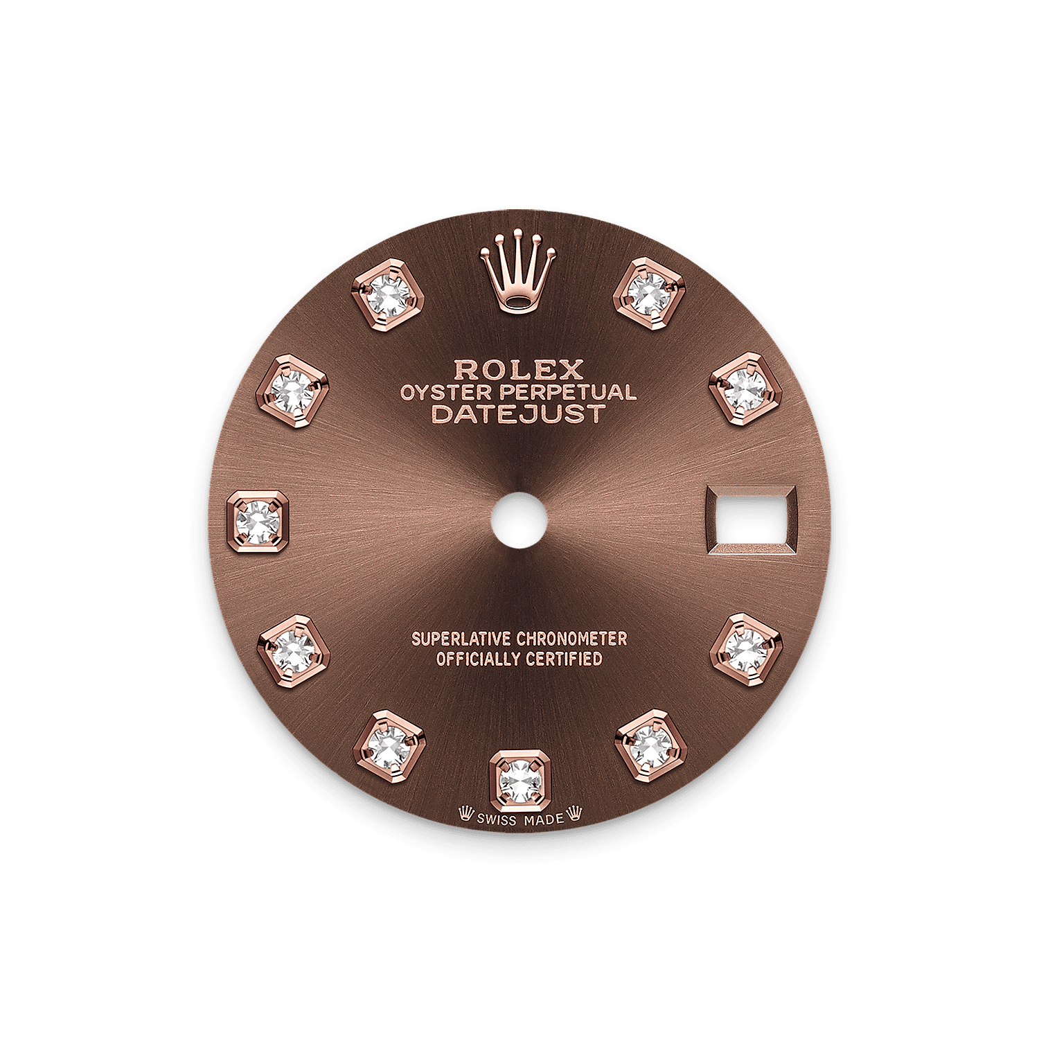 This dial features diamonds in 18 ct gold settings. The sunray finish creates delicate light reflections on many dials in the Oyster Perpetual collection. It is obtained using masterful brushing techniques that create grooves running outwards from the centre of the dial.