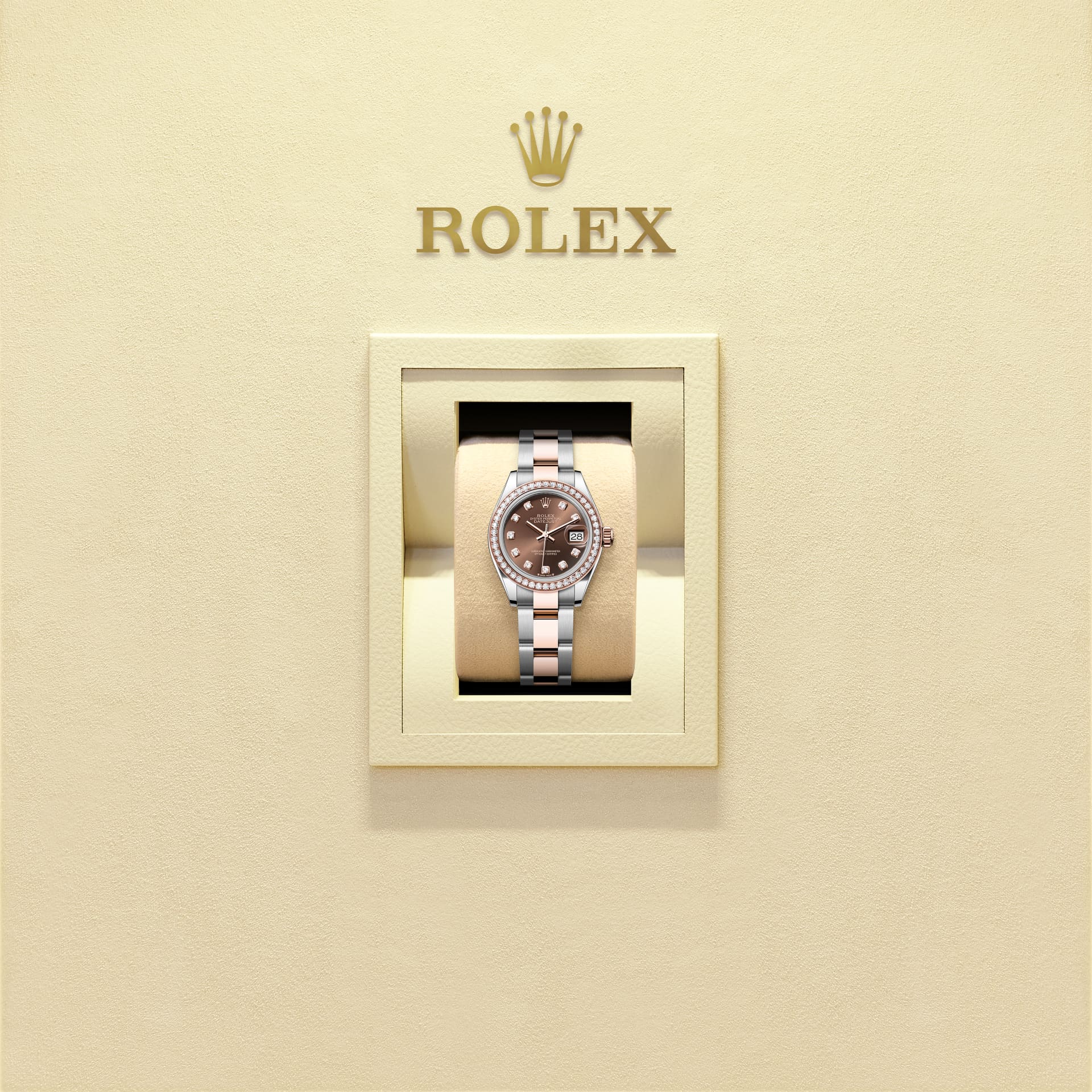 This Oyster Perpetual Lady-Datejust in Oystersteel and Everose gold features a chocolate, diamond-set dial and an Oyster bracelet.