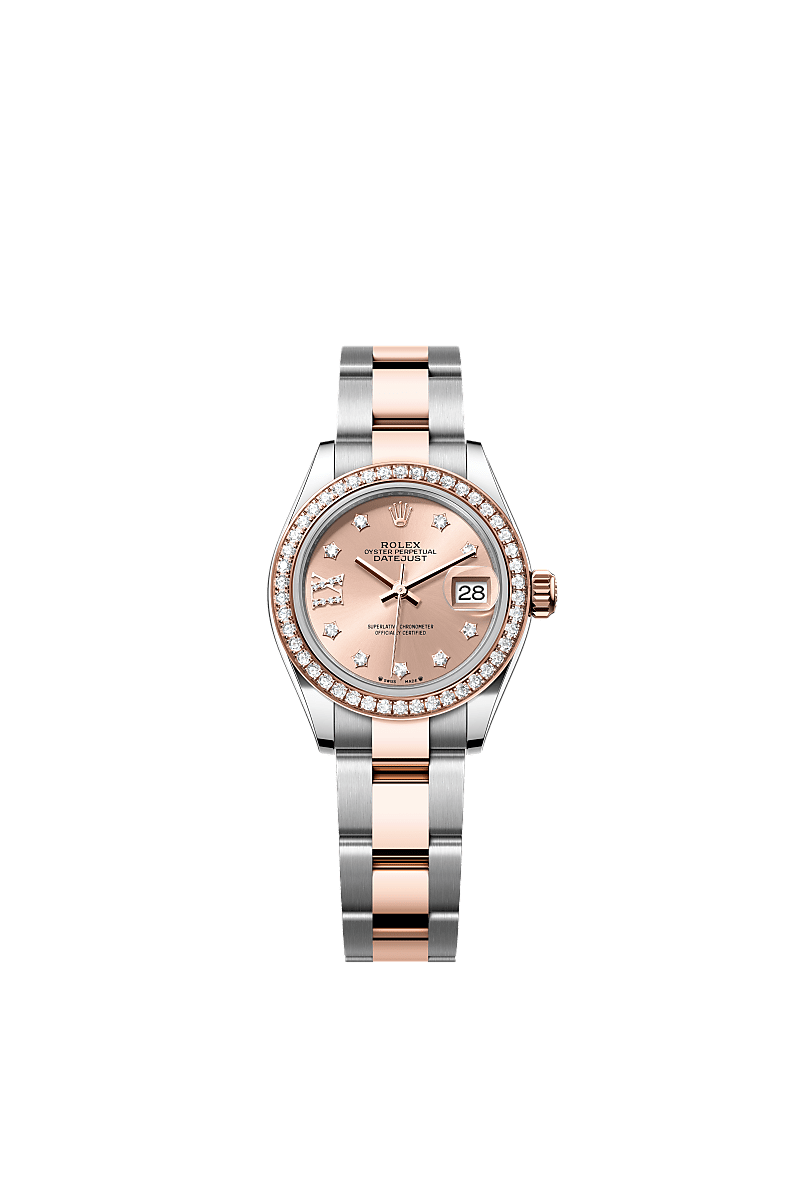This Oyster Perpetual Lady-Datejust in Oystersteel and Everose gold features a rosé colour, diamond-set dial and an Oyster bracelet.