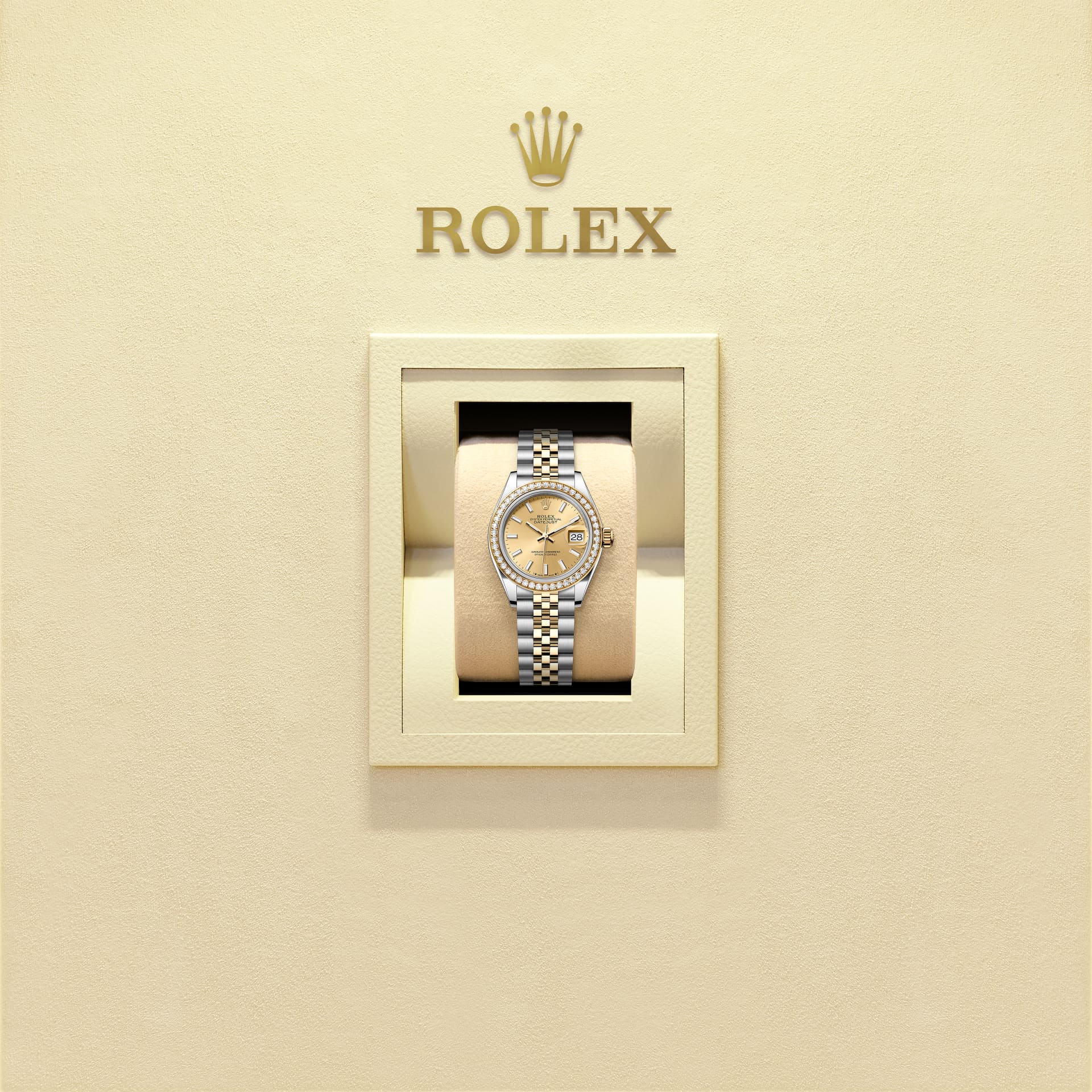 This Oyster Perpetual Lady-Datejust in Oystersteel and yellow gold features a champagne-colour dial and a Jubilee bracelet.
