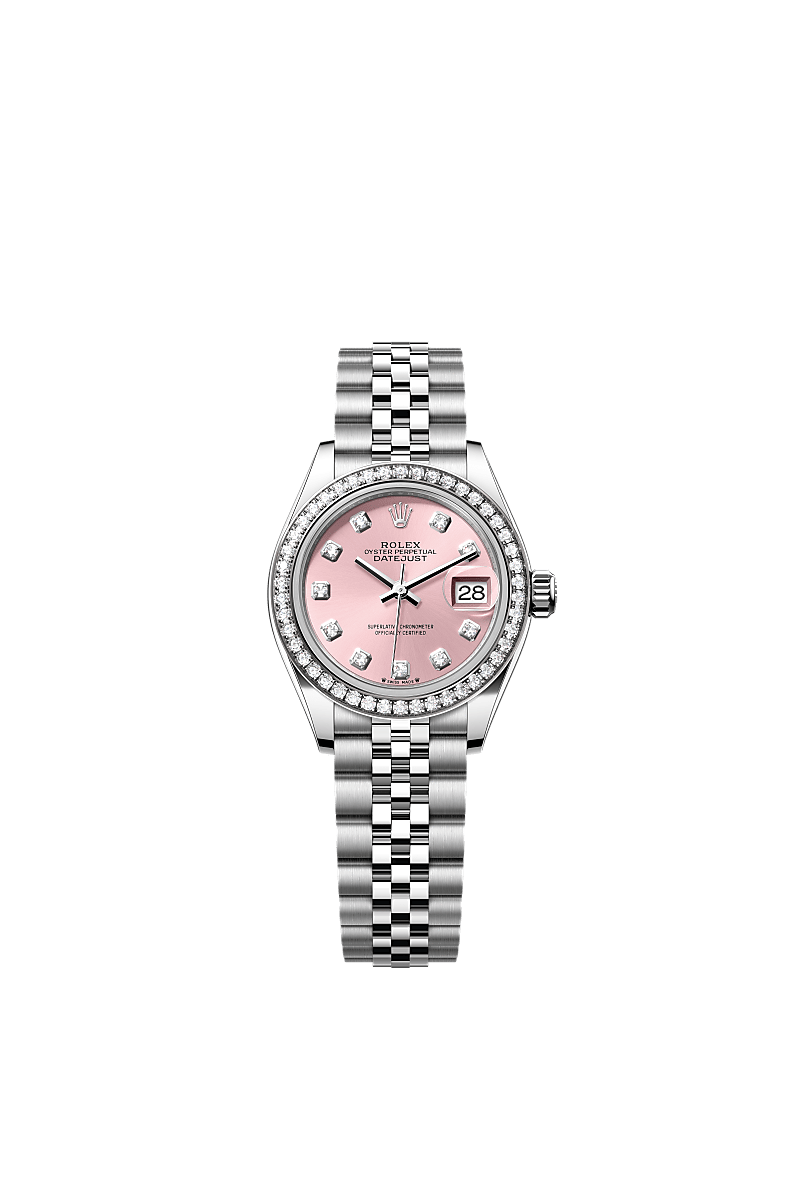 This Oyster Perpetual Lady-Datejust in Oystersteel and white gold features a pink, diamond-set dial and a Jubilee bracelet.
