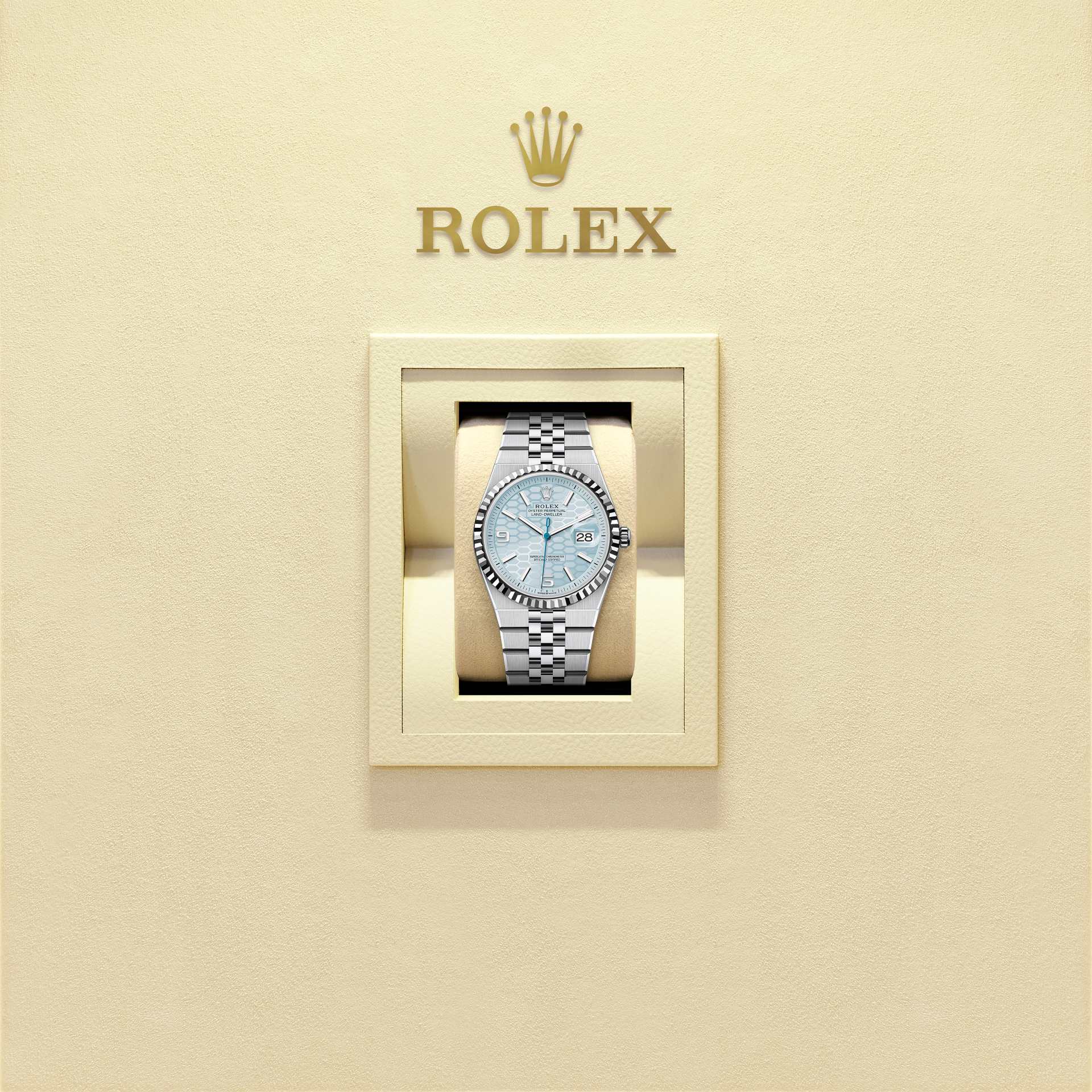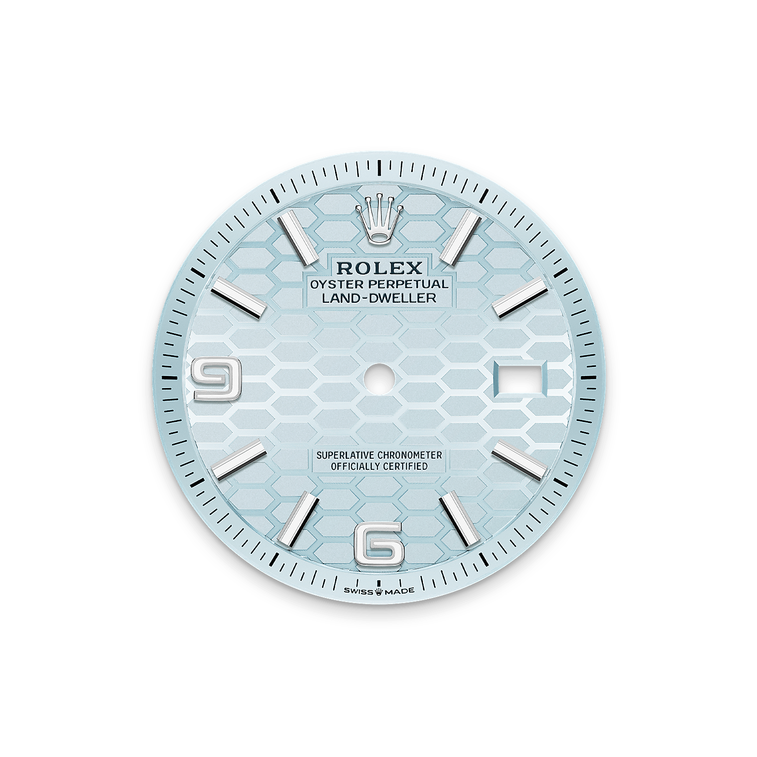The Land-Dweller 36 in platinum with an ice-blue, honeycomb-motif dial and Flat Jubilee bracelet.