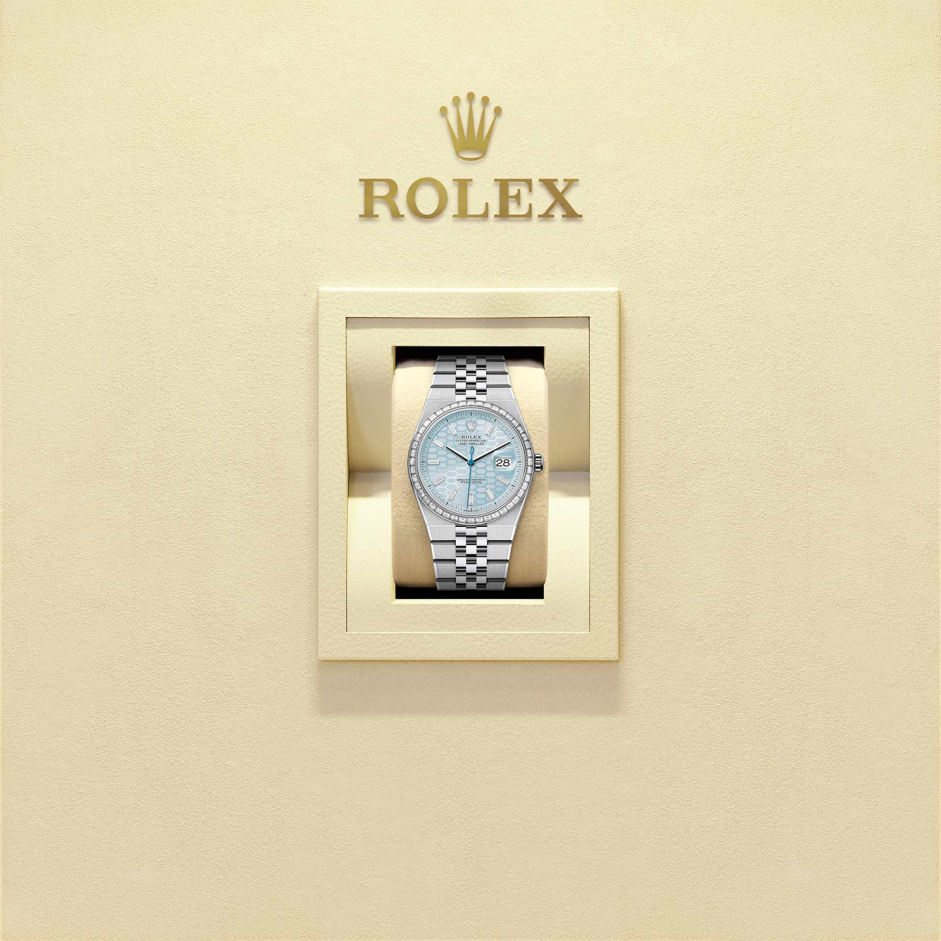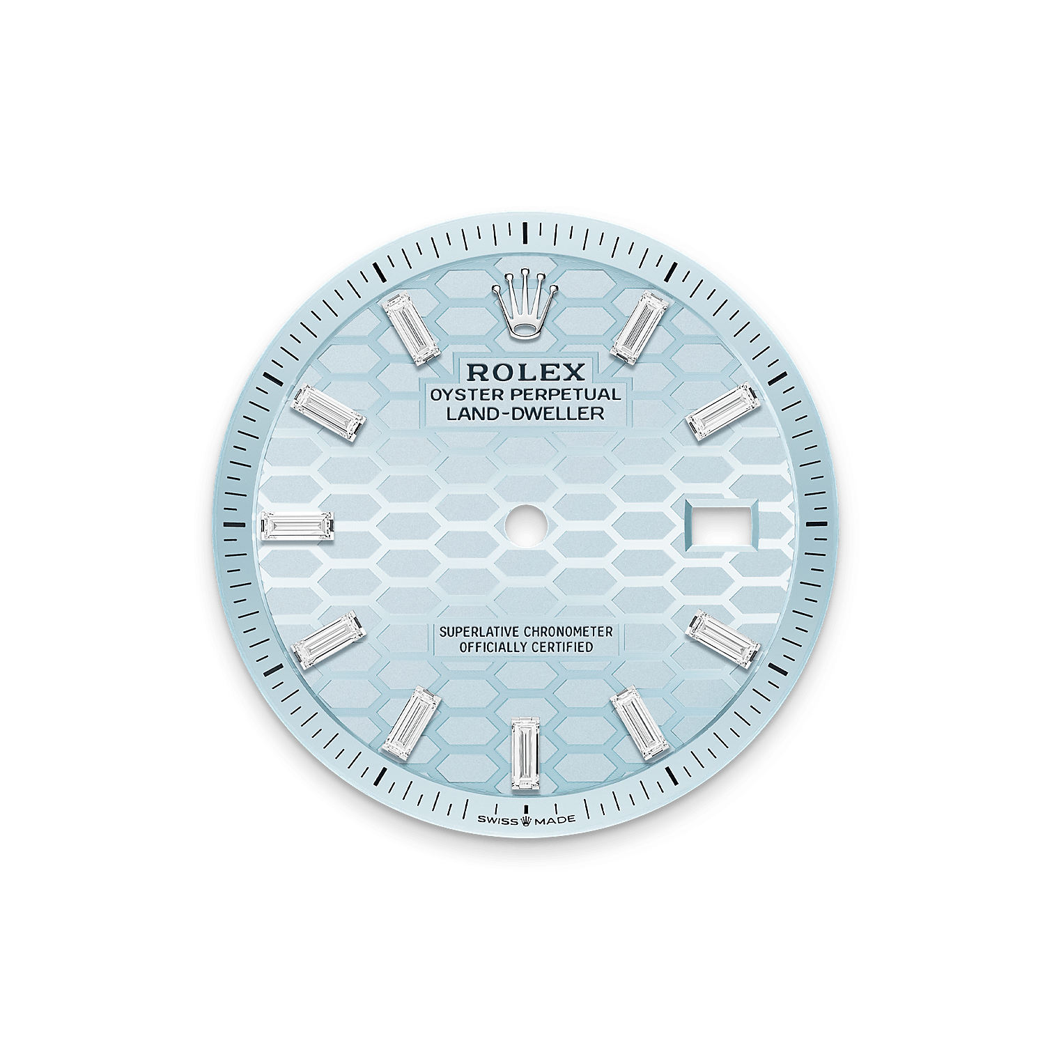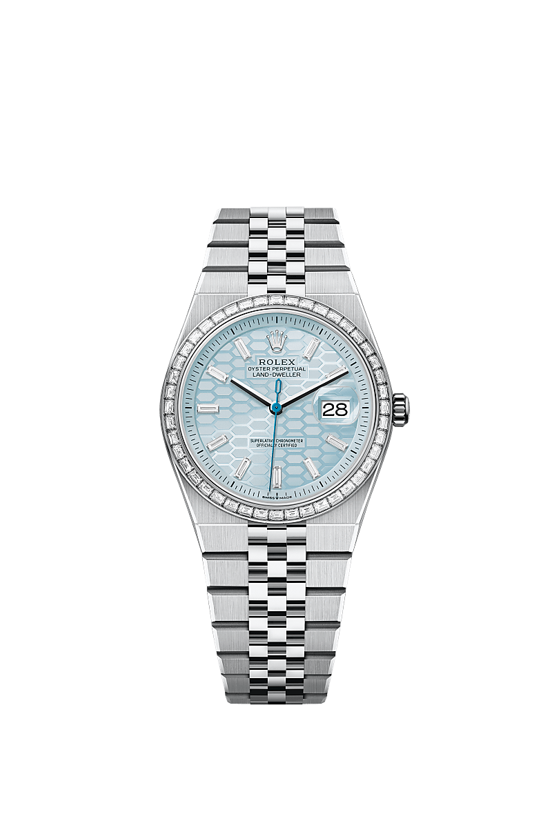 The Land-Dweller 36 in platinum with an ice-blue honeycomb-motif, diamond-set dial and Flat Jubilee bracelet.