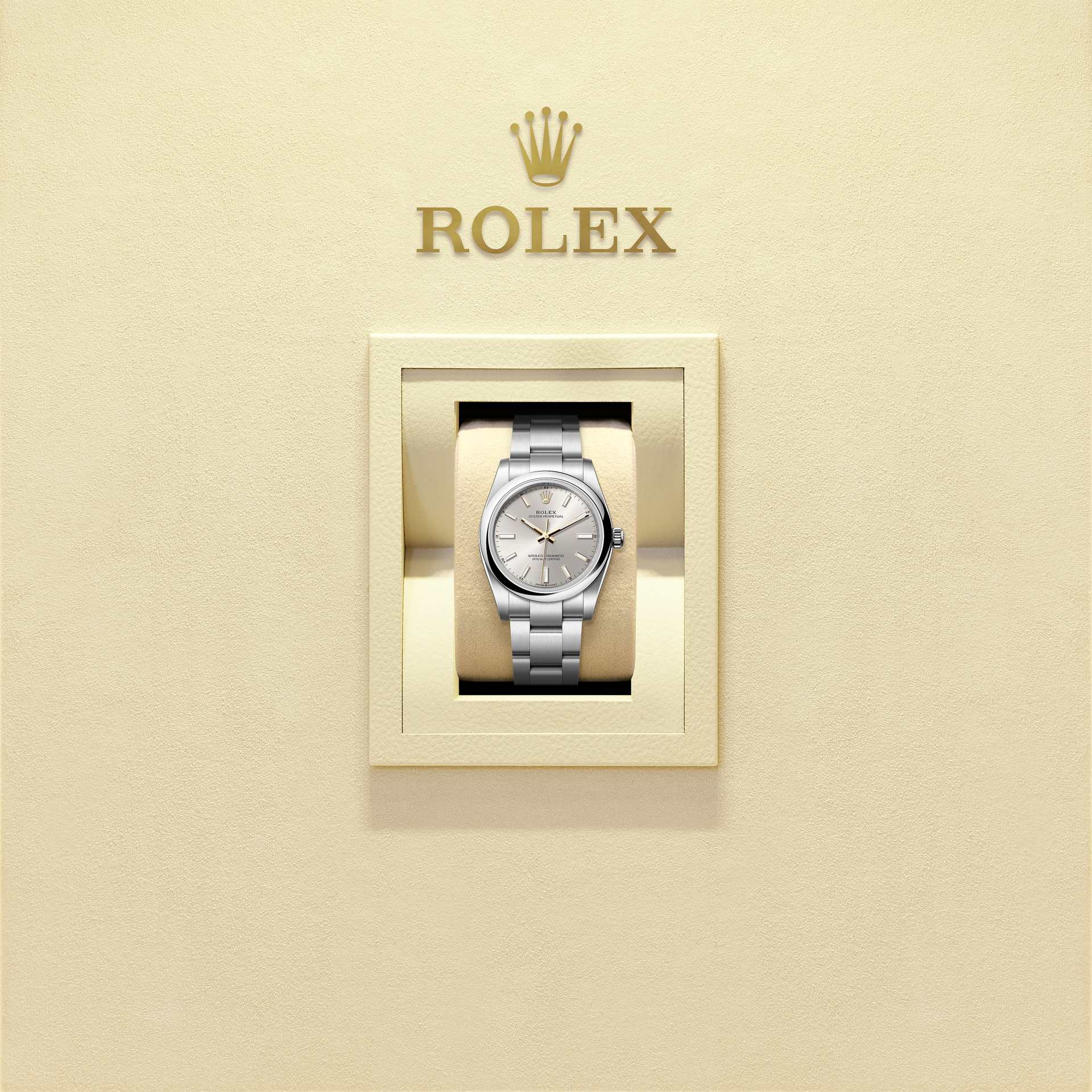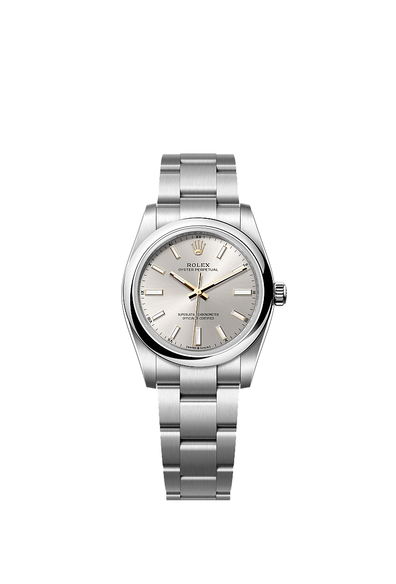 The Oyster Perpetual 34 in Oystersteel with a silver dial and an Oyster bracelet.