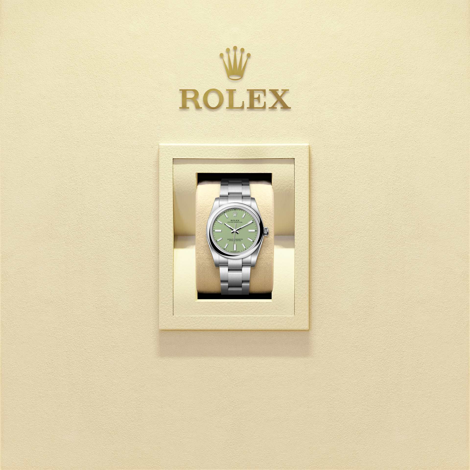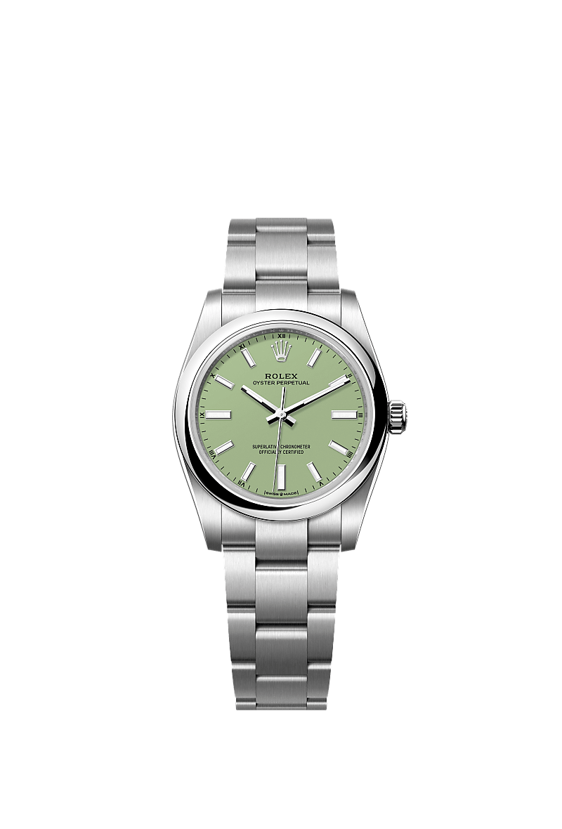 The Oyster Perpetual 34 with a pistachio dial and an Oyster bracelet.
