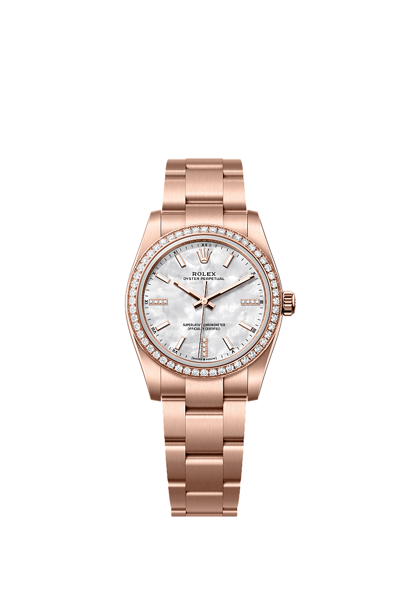 The Oyster Perpetual 34 in 18 ct Everose gold with a white mother-of-pearl, diamond-set dial and an Oyster bracelet.