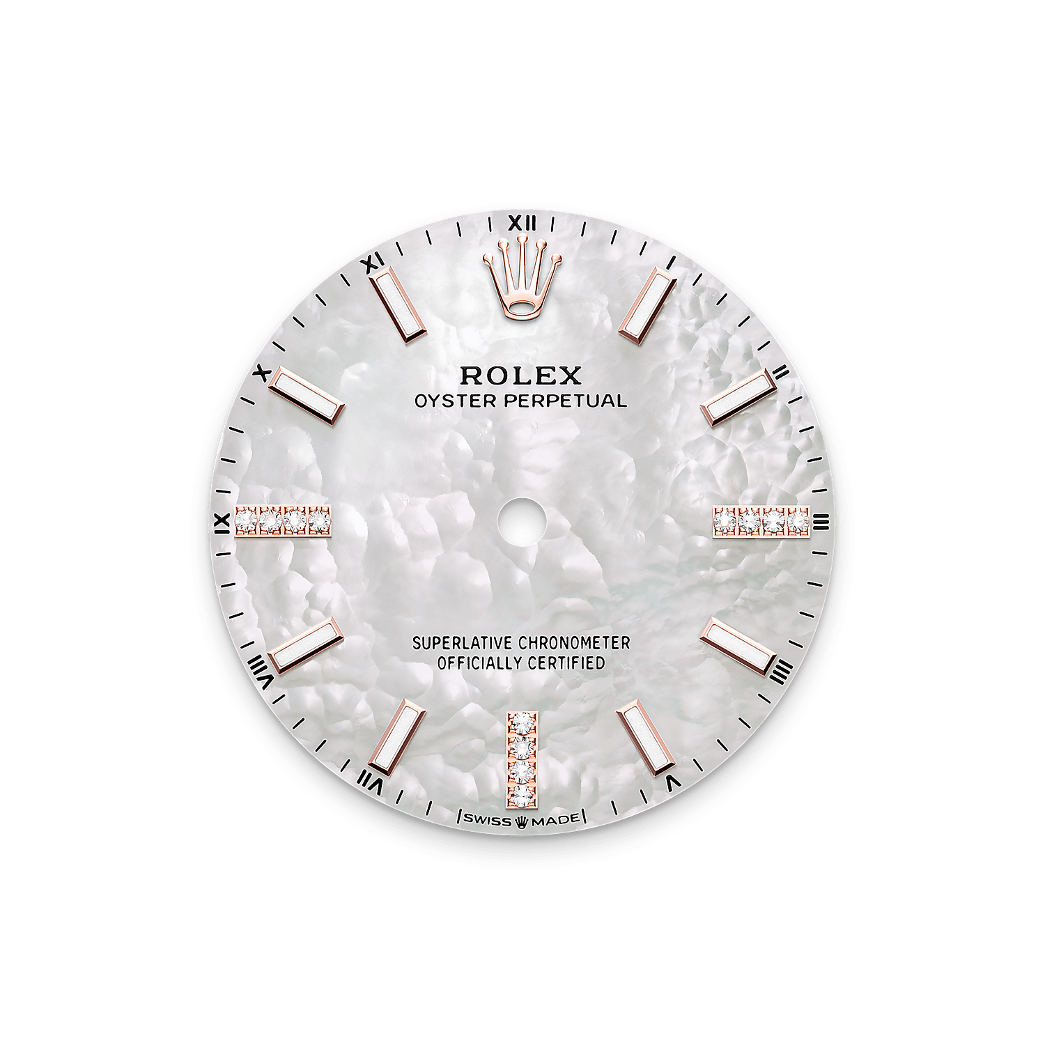 At Rolex, mother-of-pearl is never artificially coloured. Instead, particular know-how and skill are devoted to simply highlighting its natural beauty and preserving the original hues. As all mother-of-pearl dials are unique pieces, an identical dial will never be found on another wrist.