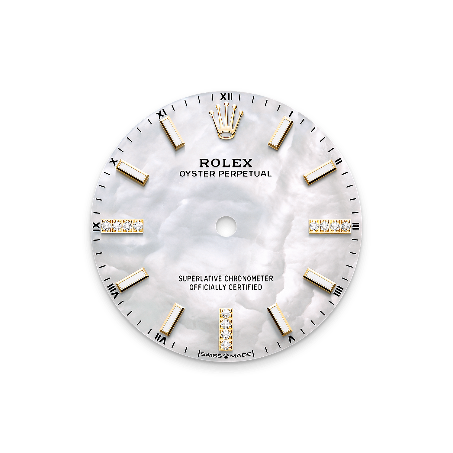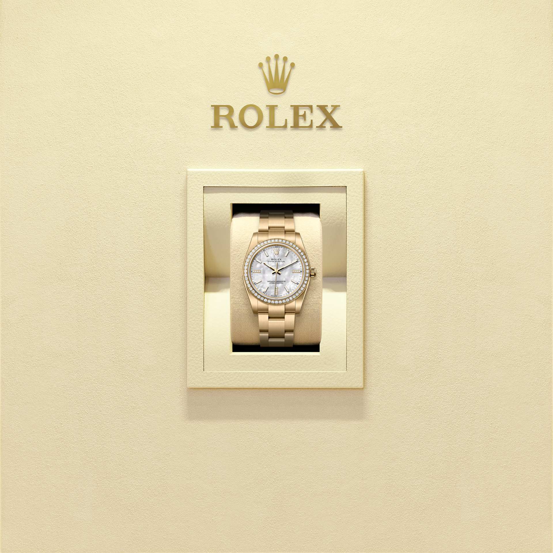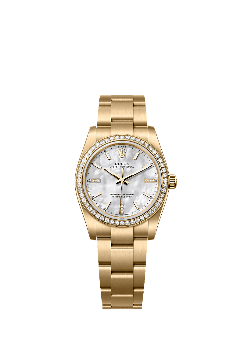 The Oyster Perpetual 34 in 18 ct yellow gold with a white mother-of-pearl, diamond-set dial and an Oyster bracelet.