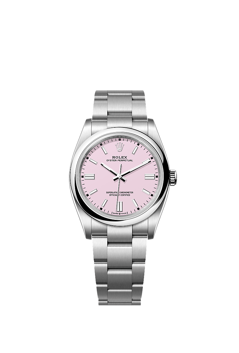 The Oyster Perpetual 36 with a candy pink dial and an Oyster bracelet.