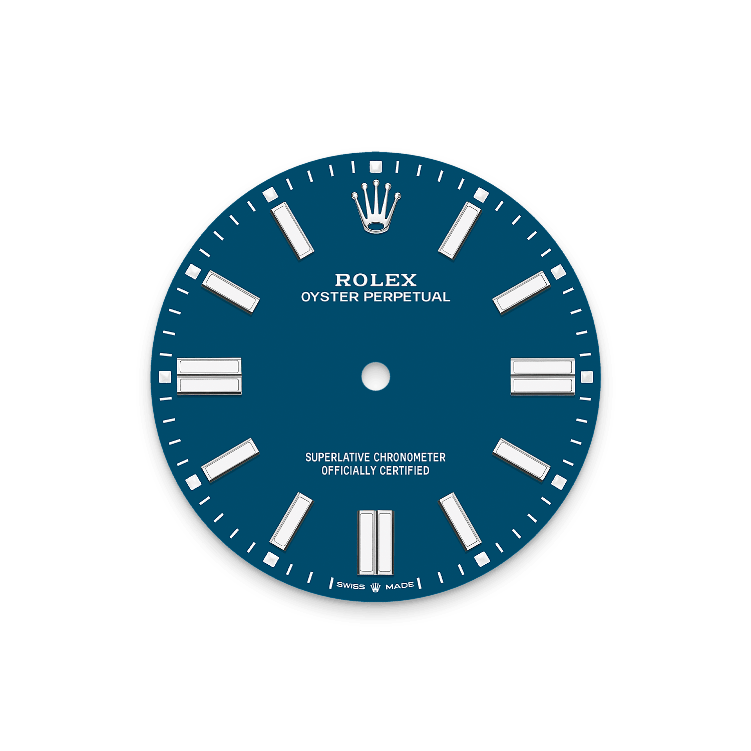 The Oyster Perpetual 41 with a med blue dial and an Oyster bracelet.