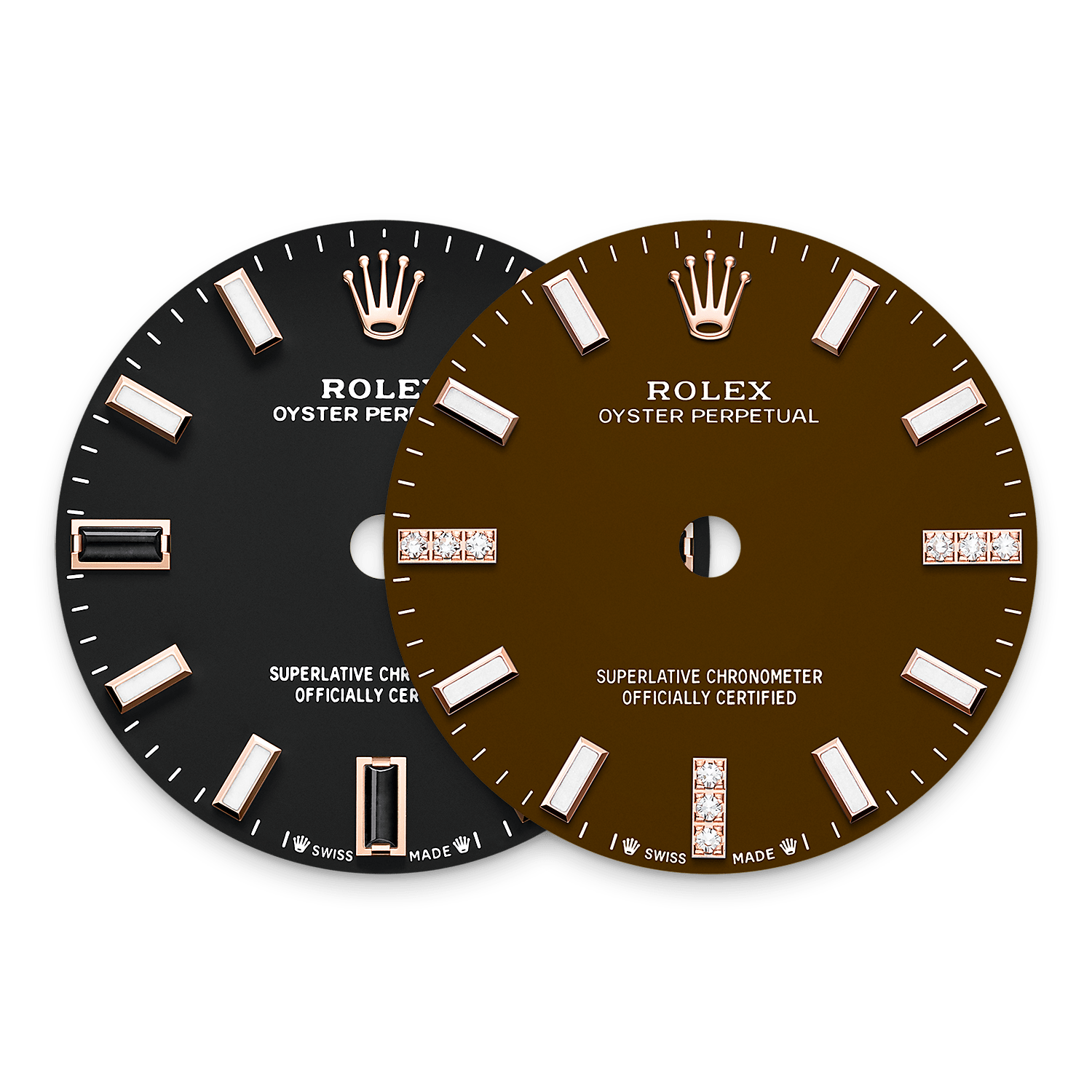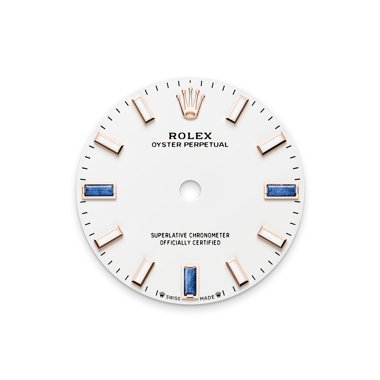 This dial features hour markers in natural stone at 3, 6 and 9 o’clock. The colours created for the Oyster Perpetual range start life as a lacquer, which must be meticulously applied in a controlled-atmosphere environment to avoid dust and other contamination.