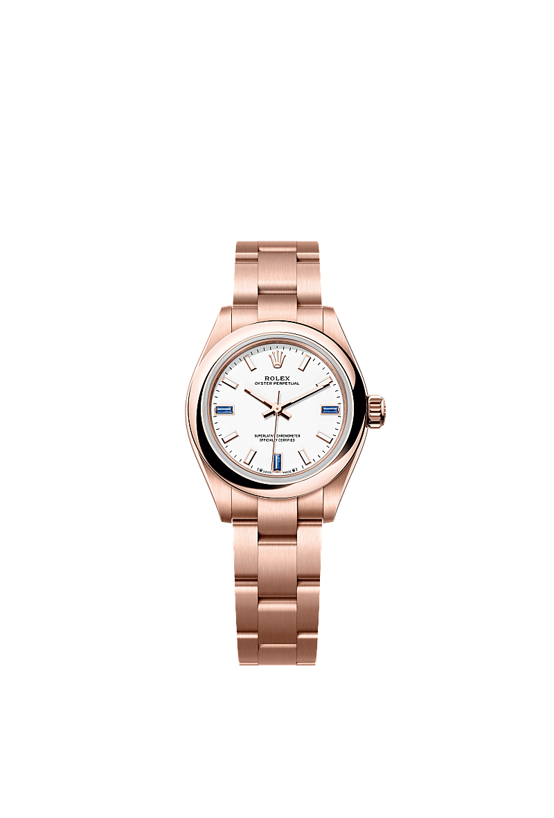 The Oyster Perpetual 28 in 18 ct Everose gold with a white dial and an Oyster bracelet.