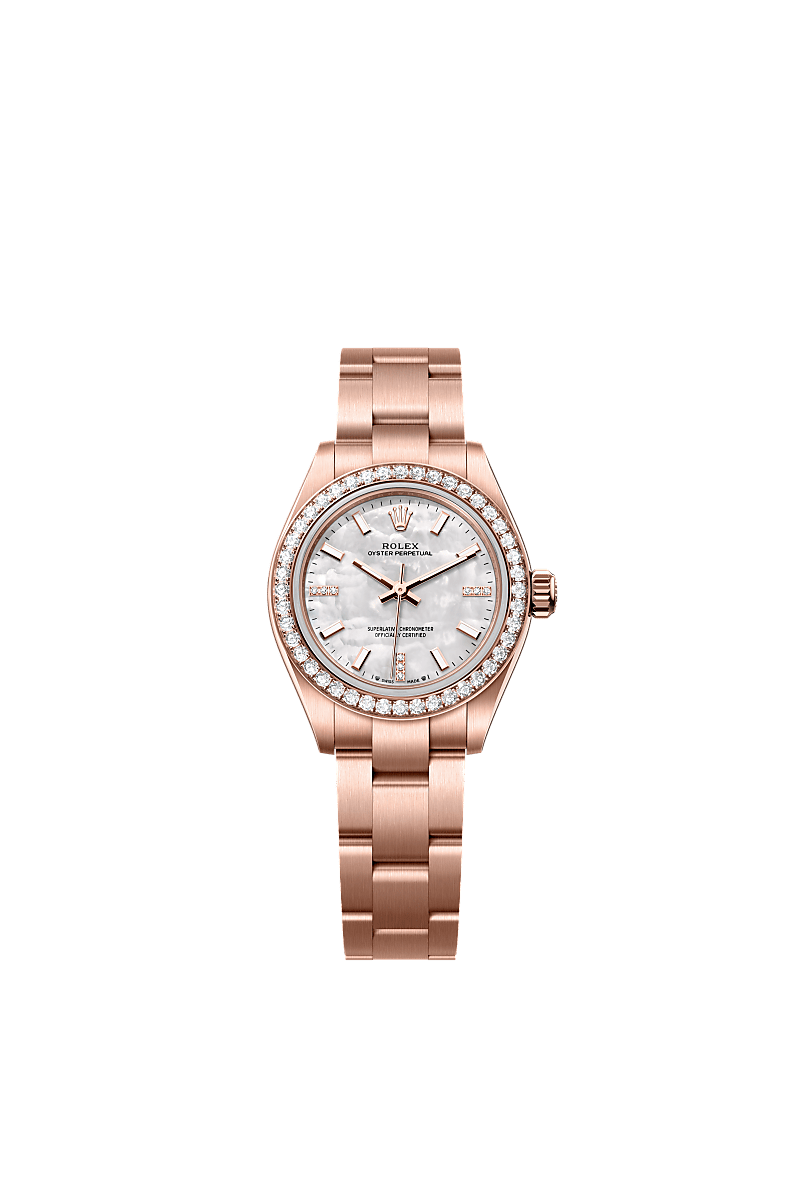 The Oyster Perpetual 28 in 18 ct Everose gold with a white mother-of-pearl, diamond-set dial and an Oyster bracelet.
